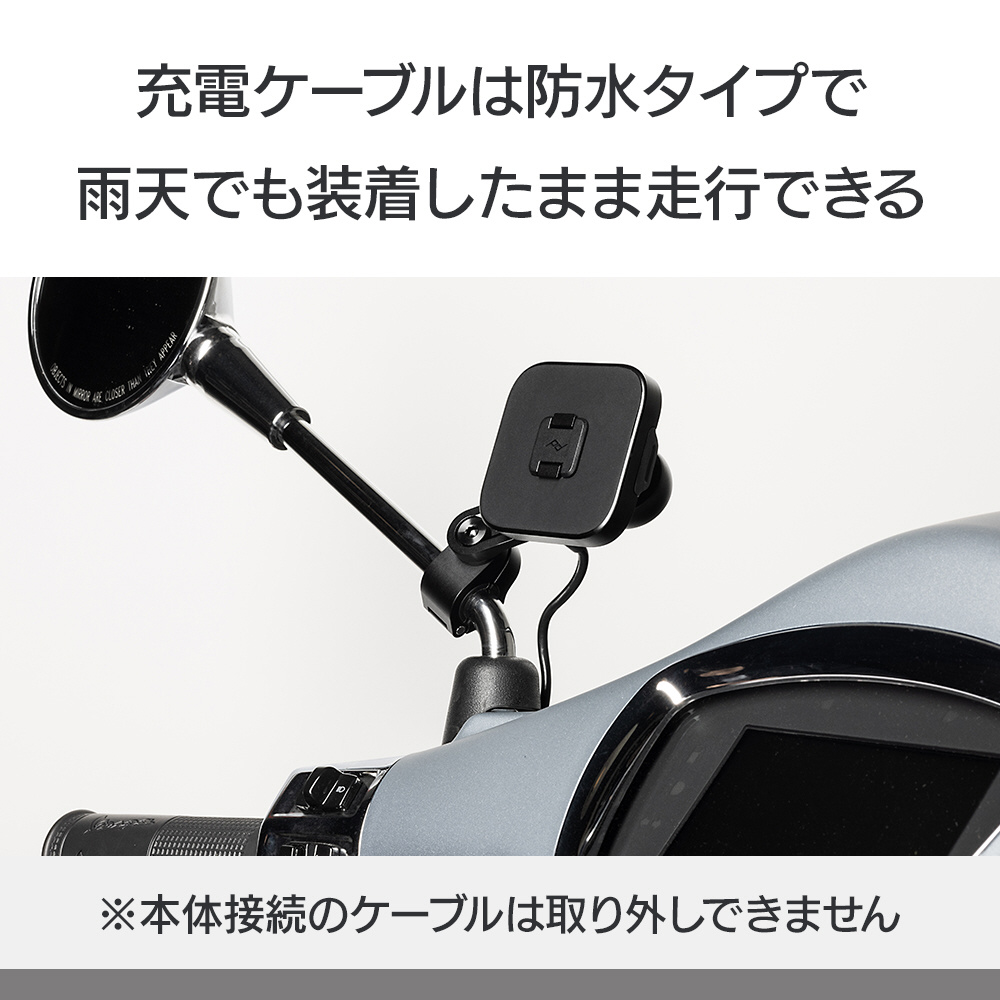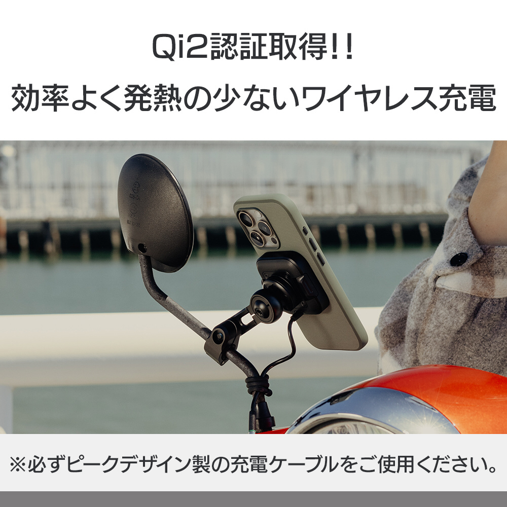※USB-A端子、またはバッテリーに直接繋げるSAE端子へ接続する場合は、別売りのピークデザイン製ケーブルキットをご使用ください。なお、Qi2充電規格の電力を得るためには、USB-CもしくはSAE端子のケーブルが必要です。