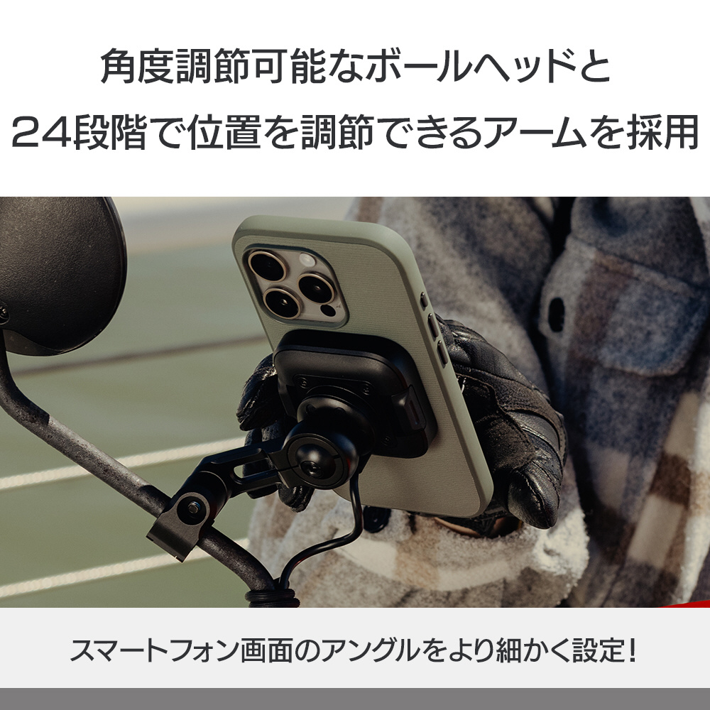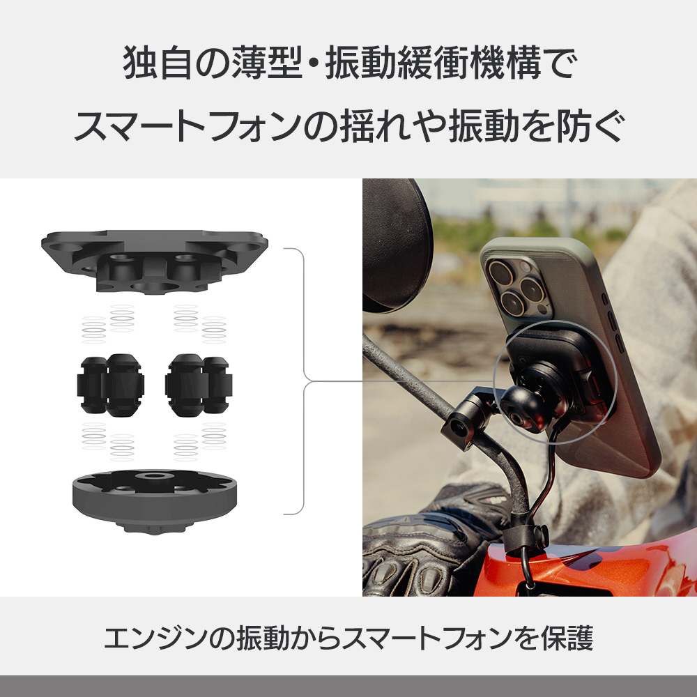 モーターバイク用マウント専用に、独自の振動緩衝機構を開発。緻密に設計された技術により、薄型でかさばらない形状ながらも効果的にスマートフォンの揺れや振動を防止し、エンジンの振動からスマートフォンを保護します。