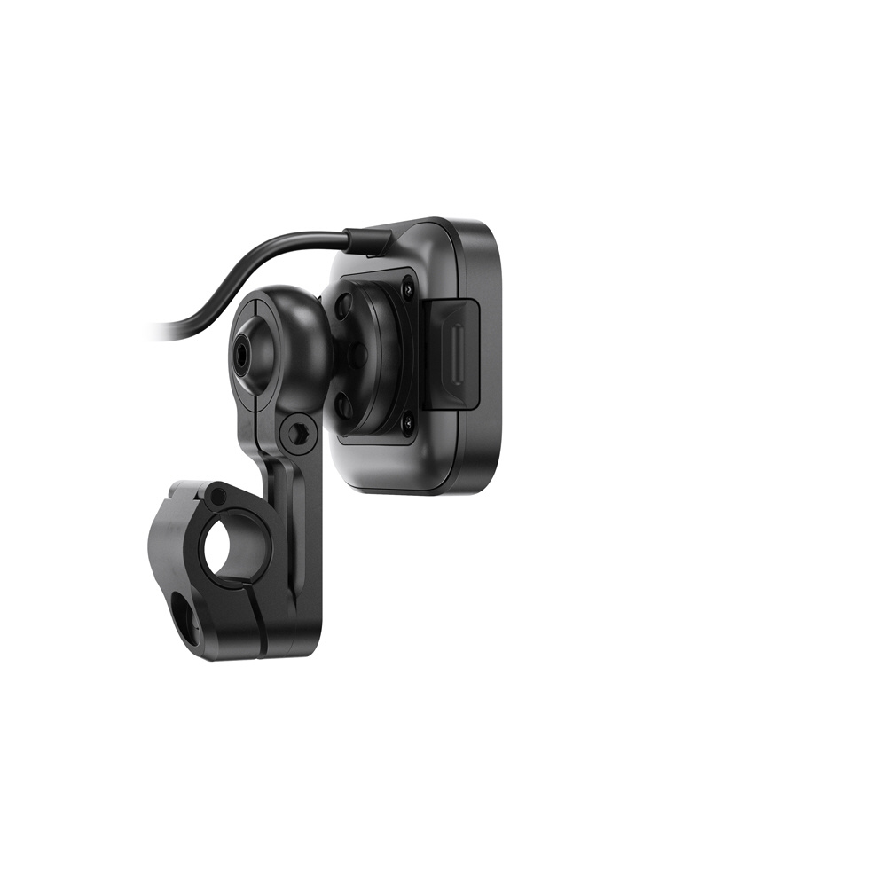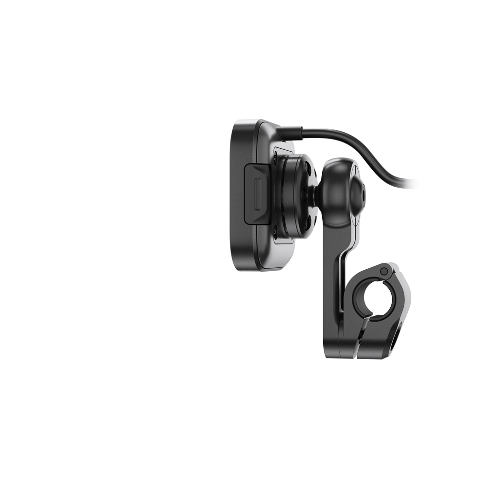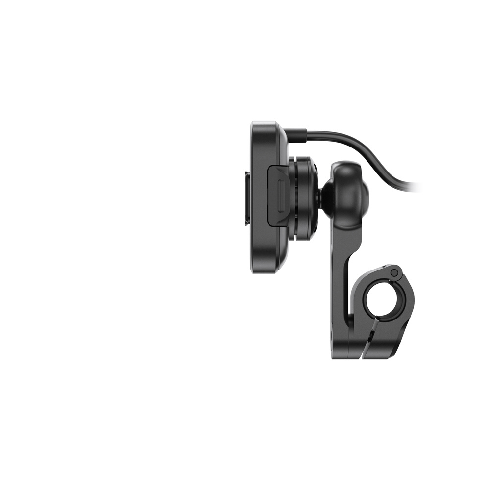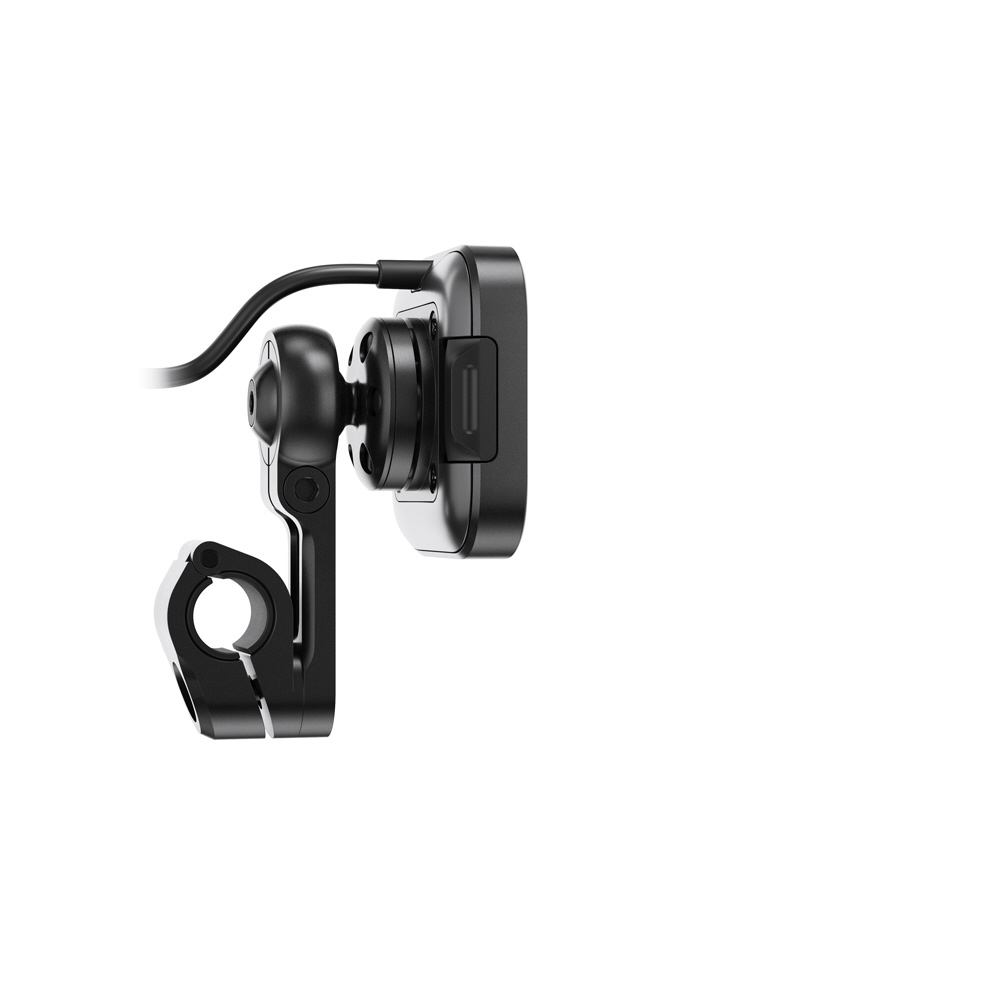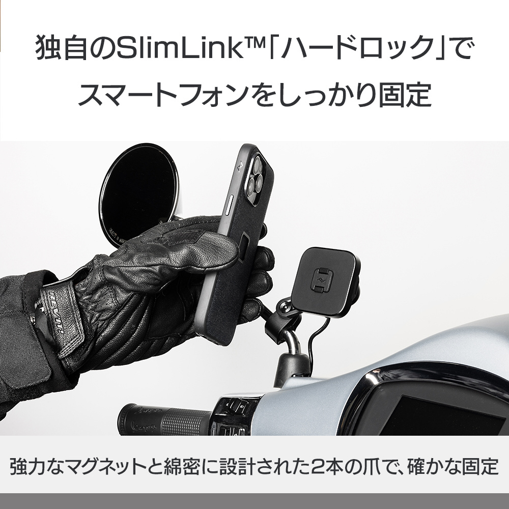 本体は耐水性に優れた頑丈なアルミ製で、ヘッド部分の独自機構によりスマートフォンの揺れや振動を防止します。SlimLink?のハードロックによりしっかりとスマートフォンを固定し、取り外す際にはヘッド部分のプッシュボタンで簡単にロックを解除できます。バイク用グローブを装着した状態でも、スマートフォンの着脱が可能です。