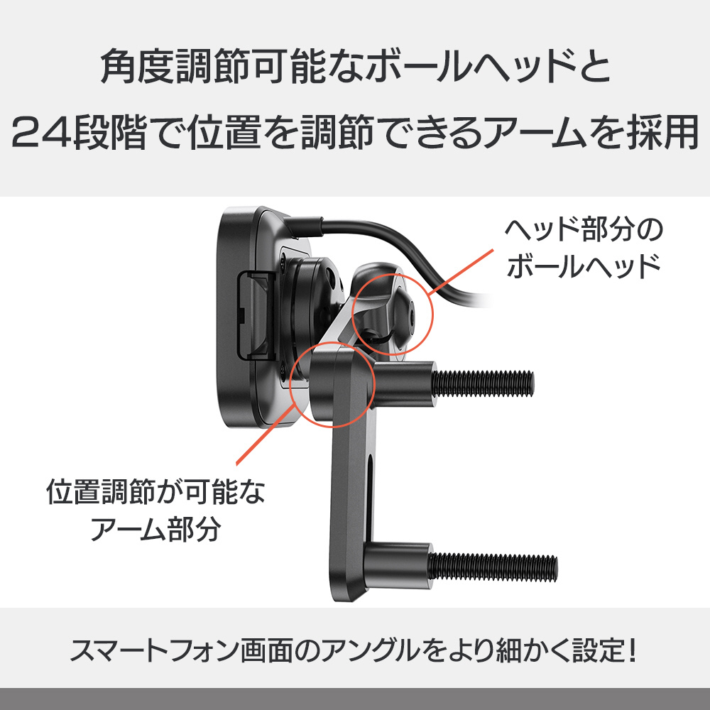アーム部分は24段階で位置を調節でき、ヘッド部分には自由な角度調節を可能にするボールヘッドを内蔵。スマートフォンの位置や画面のアングルを細かく調節できます。