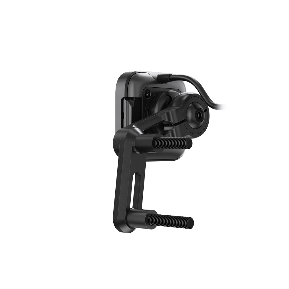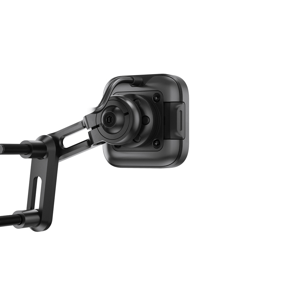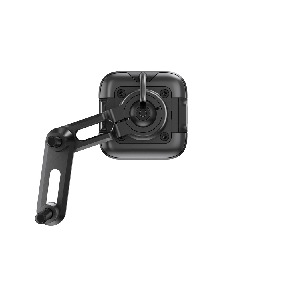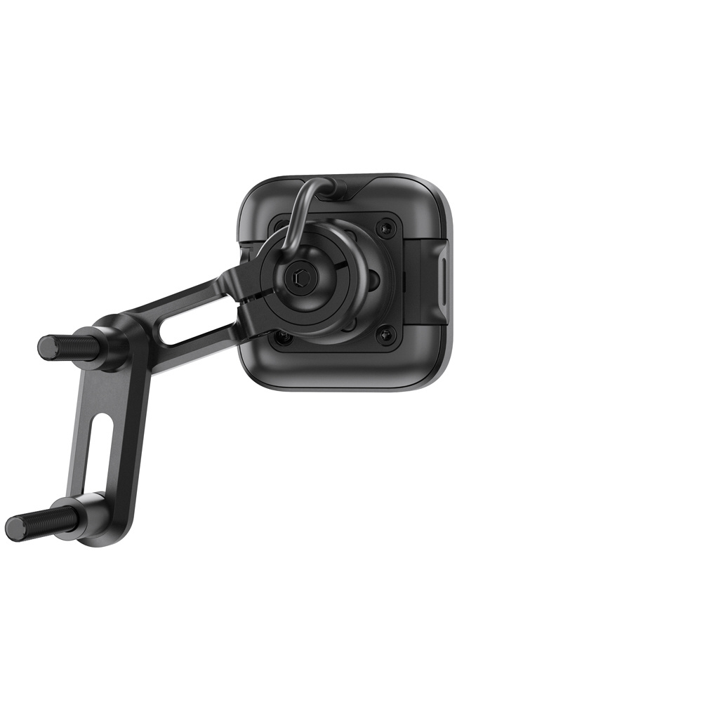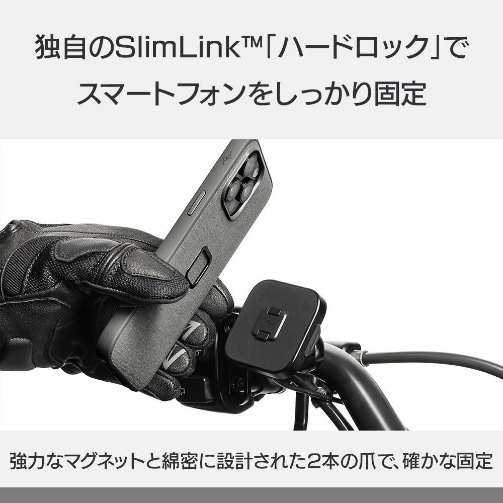 本体は耐水性に優れた頑丈なアルミ製で、ヘッド部分の独自機構によりスマートフォンの揺れや振動を防止します。SlimLink?のハードロックによりしっかりとスマートフォンを固定し、取り外す際にはヘッド部分のプッシュボタンで簡単にロックを解除できます。バイク用グローブを装着した状態でも、スマートフォンの着脱が可能です。