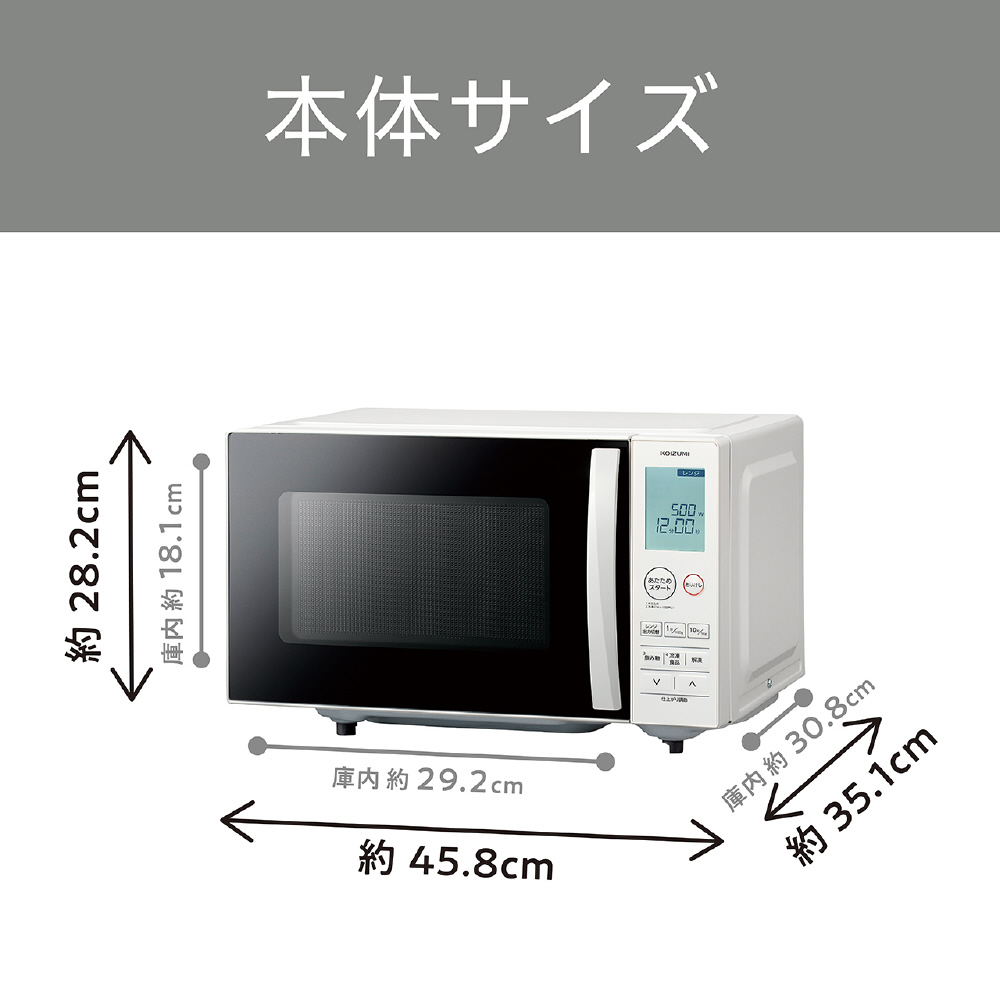 お手入れ簡単フラット庫内、見やすい大型液晶表示のデカ文字、自動あたため機能搭載(湿度センサー)