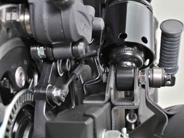 ※右側のブレーキホースガイドがリアショックと接触するために内側に曲げる必要があります。
