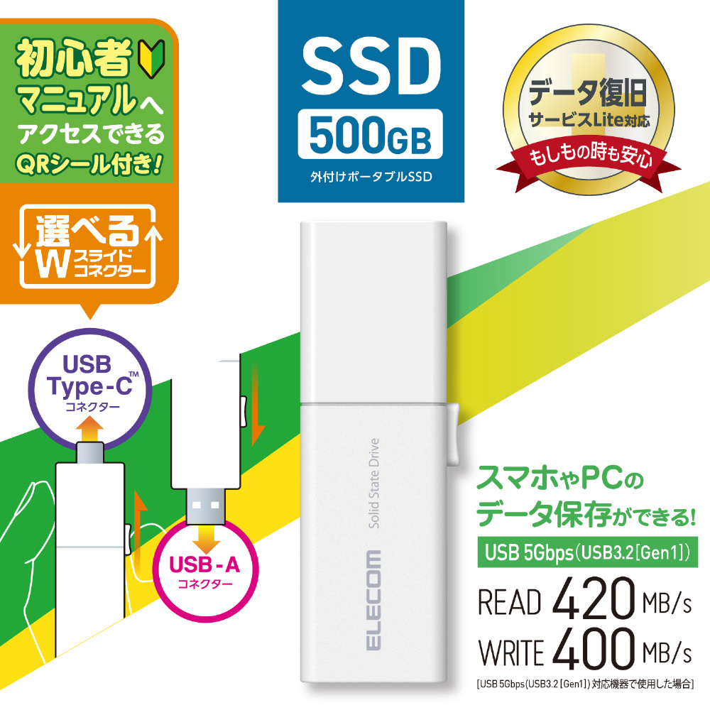 ESD-EWB0500GWHR 外付けSSD USB-C+USB-A接続 スマホ向け・PS5対応(Android/iPadOS/iOS/Mac/Windows11対応) ホワイト [500GB /ポータブル型]