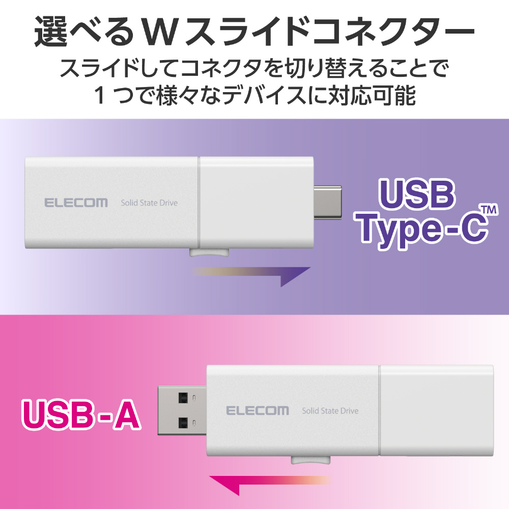選べるWスライドコネクター。スライド操作でUSB-AとUSB Type-C(TM)を切り替えられます。パソコン・スマートフォン・ゲーム機などさまざまなデバイスで使えます。