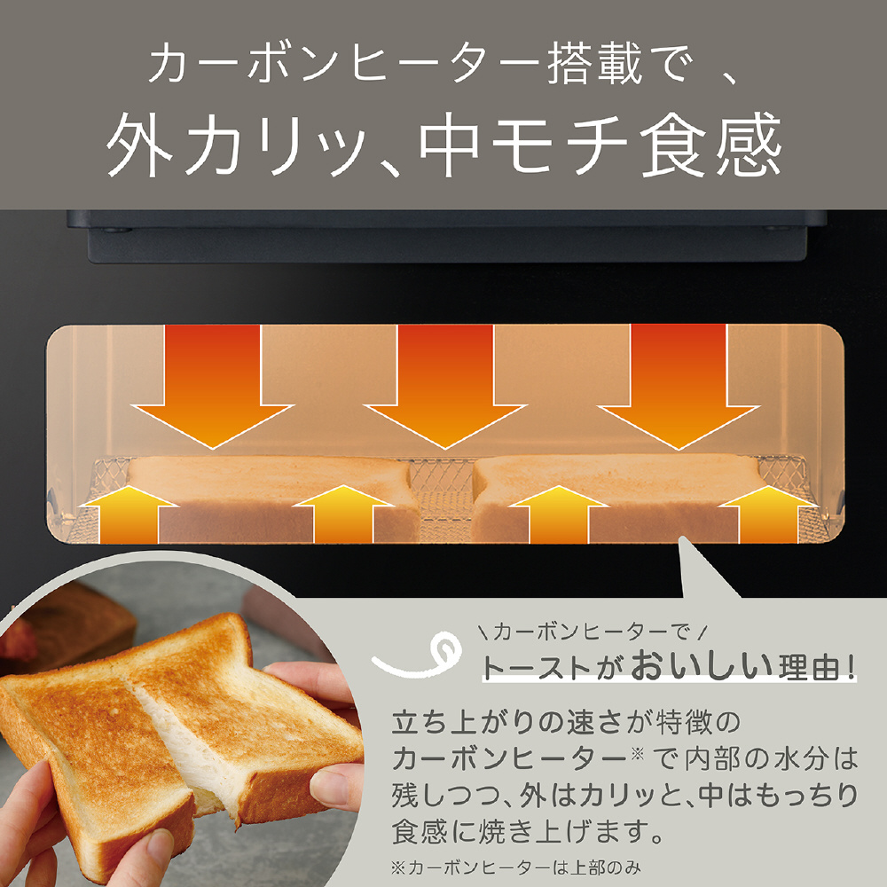 上面カーボンヒーター、2種類のプレートでハンバーグやパンが作れる、トースト2枚焼き