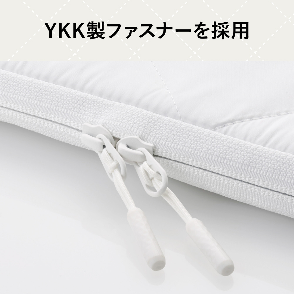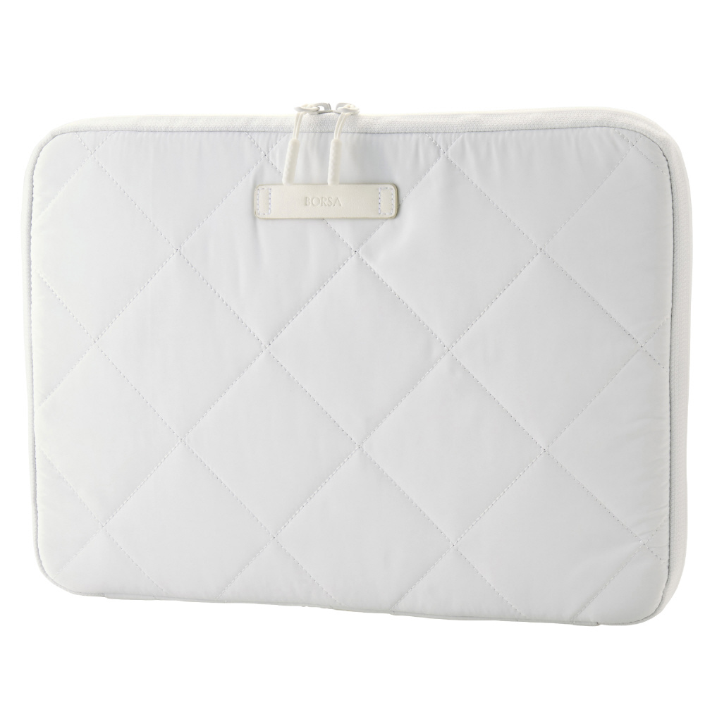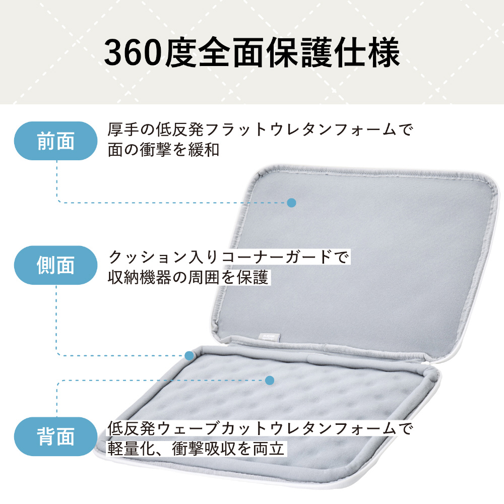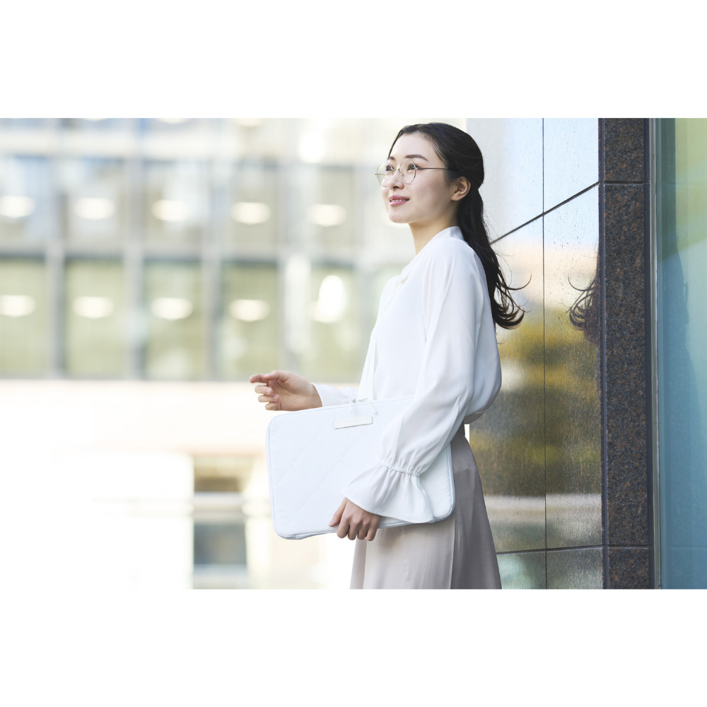 保護性能とデザイン性を両立!上品な光沢のあるクロスステッチのキルティング素材を採用した、オトナ可愛いデザインのインナーケースです。側面を360度保護するコーナーガードクッションと、天面、底面それぞれに内蔵された低反発ウレタンフォーム、機器表面を傷つけにくい内側の優しい起毛生地によって、ノートパソコンなど収納物を徹底的に保護します。