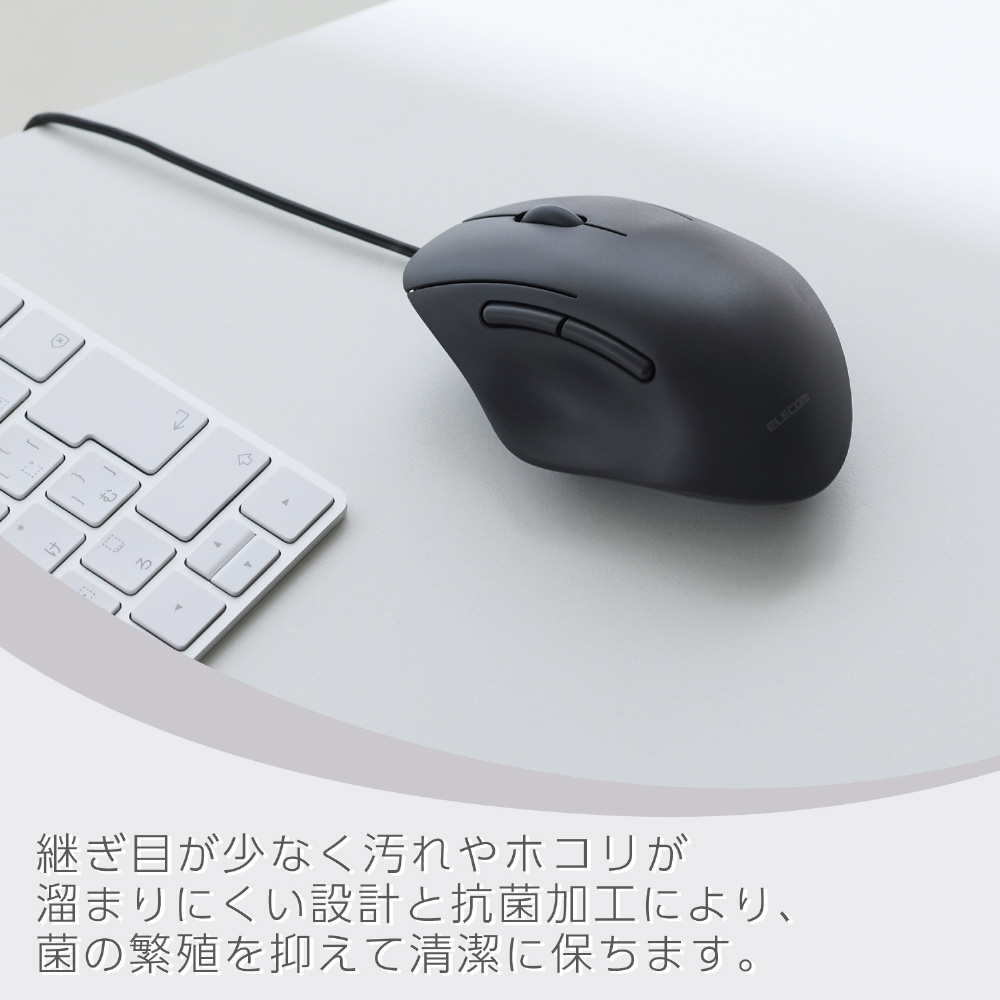 継ぎ目が少なくホコリが溜まりにくい設計に加え、マウスの表面に抗菌加工を施し、いつでも清潔さを保ちます。 抗菌加工により、マウスの表面に付着した菌の繁殖を抑えて清潔に保ちます。(抗菌範囲:マウス筐体、印刷部分)