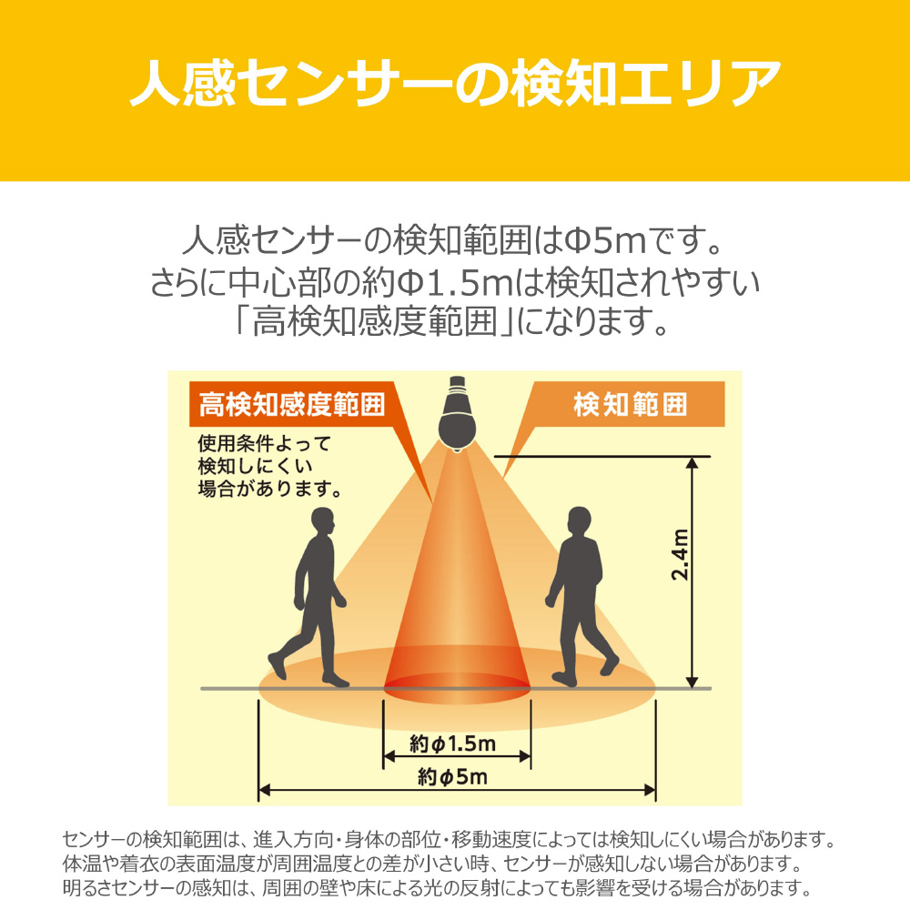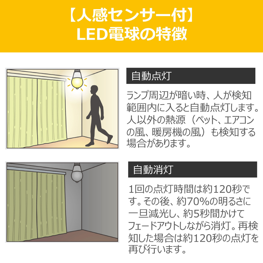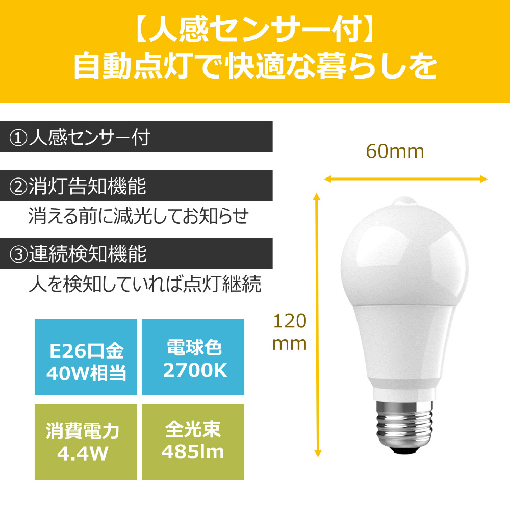 LED電球 人感センサー付き 電球色(2700K) 485lm 平均演色評価数Ra90