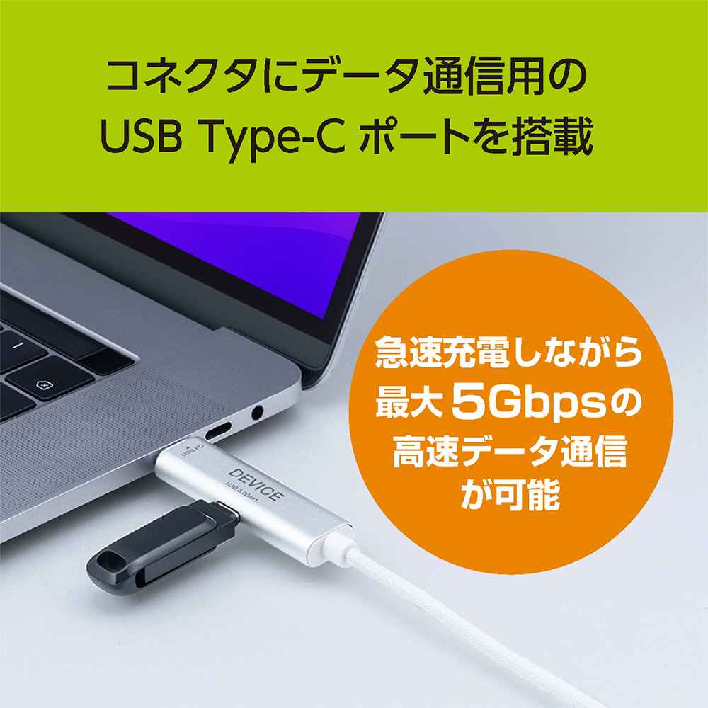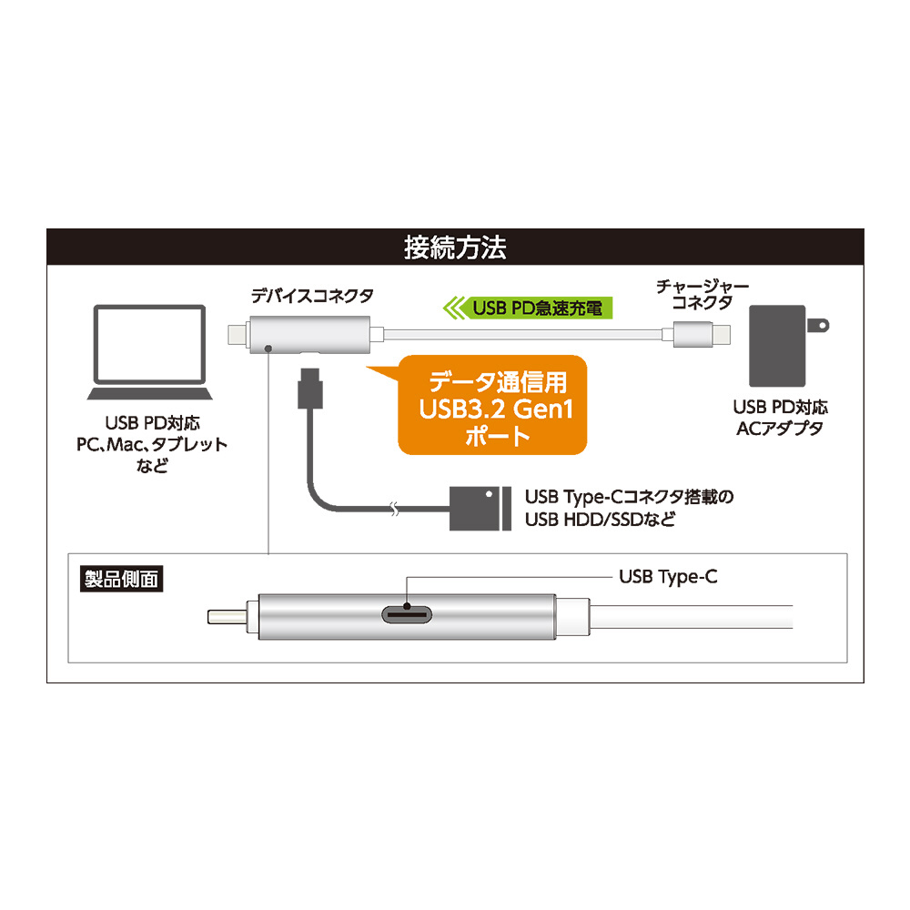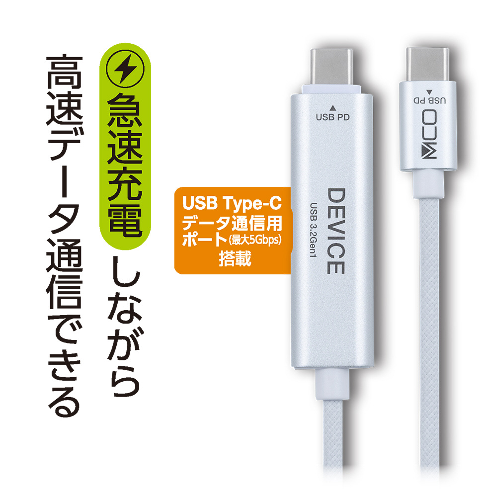 データ通信用のType-Cポートを搭載したUSB PD充電ケーブル