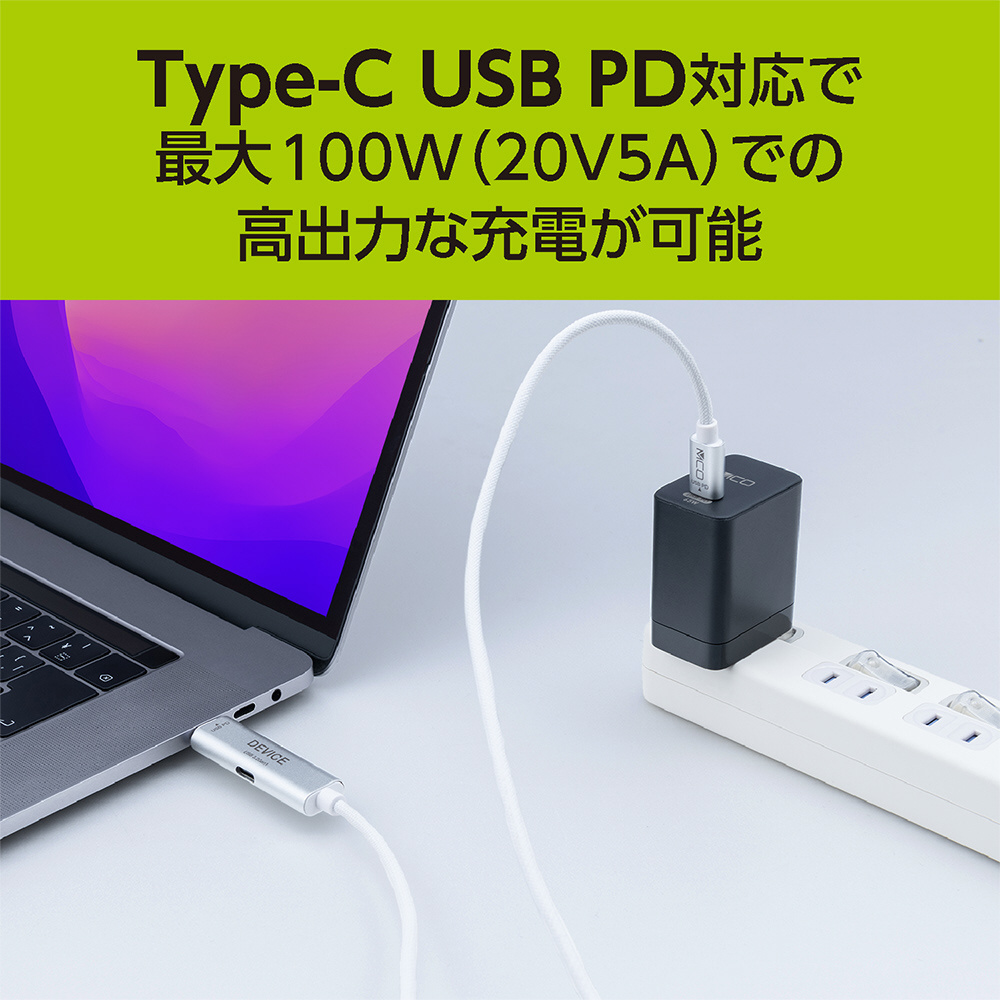 USB Type-Cで充電するPCやMacBookシリーズ等で使用できるUSB PD(PowerDelivery)規格に対応した充電ケーブルです。