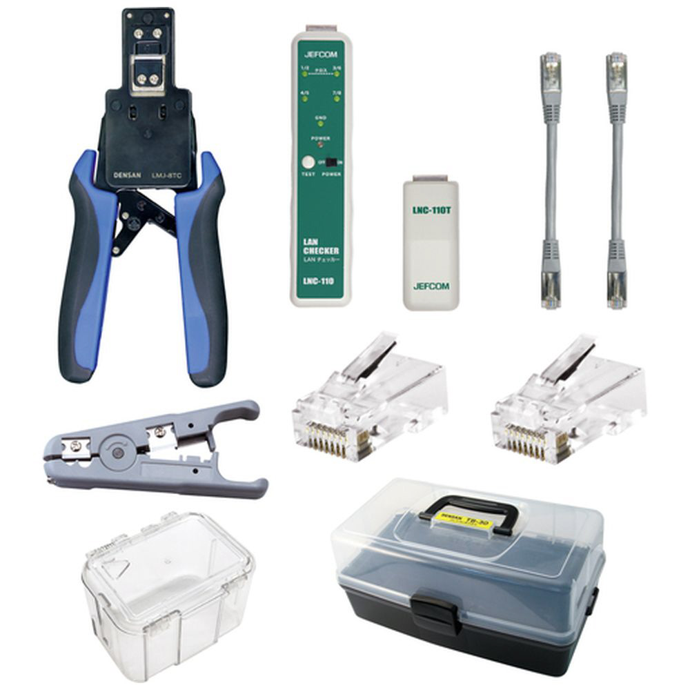 LAN工事の必需品を収納ケースにまとめたツールキットです。貫通式モジュラープラグに対応したモジュラー圧着工具LMJ-8TCも付属しており、テレワーク環境の構築にも最適です。Cat6通信環境へのアップグレード工事にも対応できます。