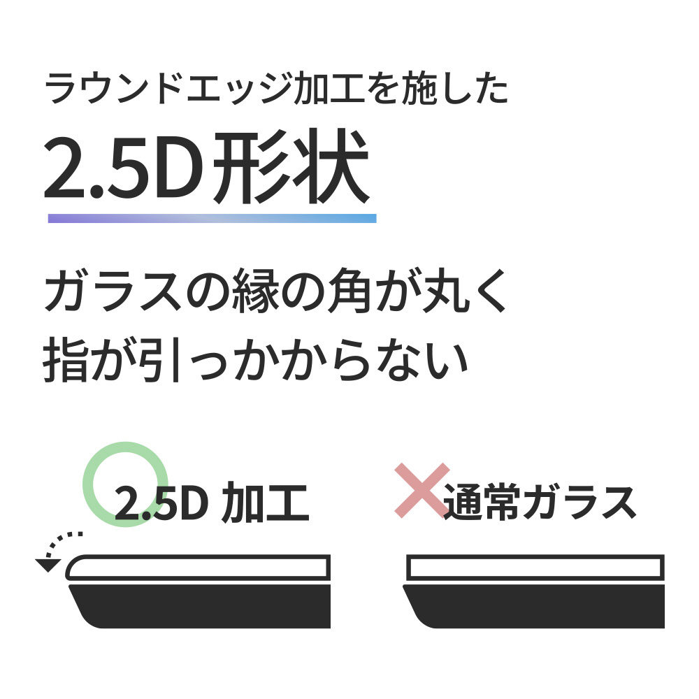 ガラスの縁にある角を丸めて指が引っかからないようにする、ラウンドエッジ加工を施した2.5D形状に仕上げています。ガラスの縁に指が引っかからず、快適な操作が可能です。