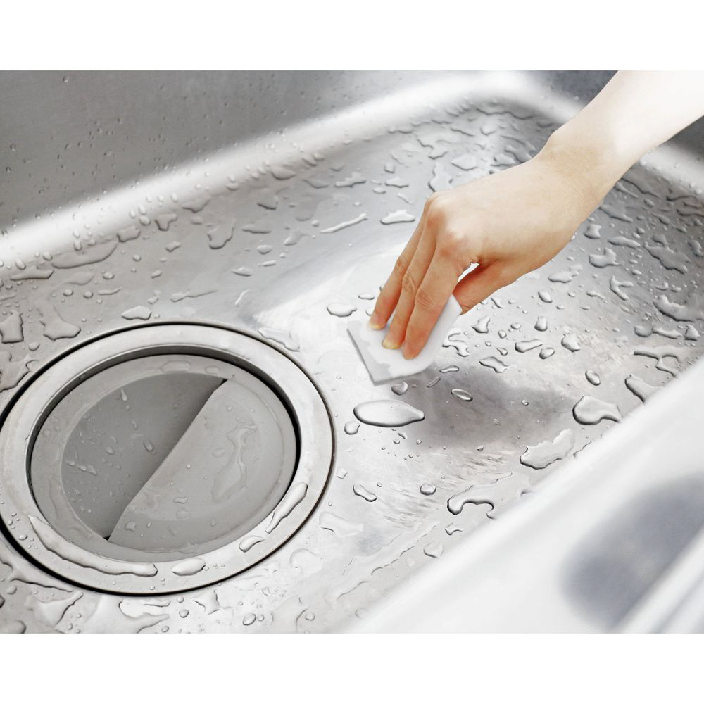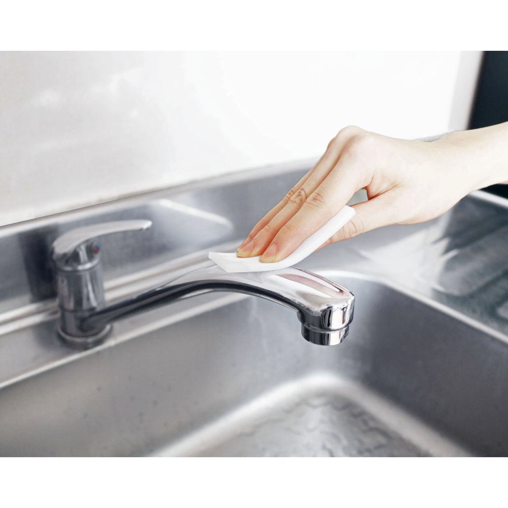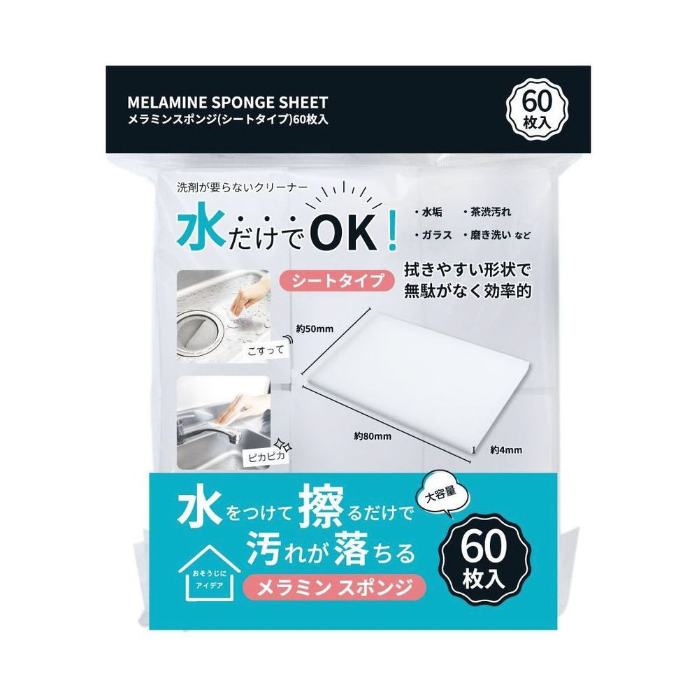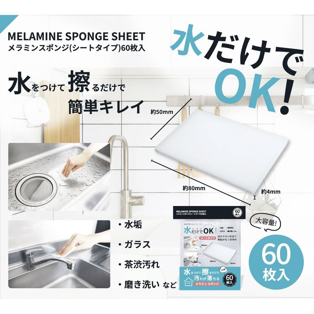 水をつけて擦るだけで汚れが落ちるメラミンスポンジです。水をつけてこするだけで水垢、ガラスについた汚れ、茶渋汚れなどが簡単キレイに落ちます。メラミン素材なのでキッチンシンクの磨き洗いにも使えます。シートタイプで無駄がなく効率的にお使いいただけます。【仕様】シートタイプ60個入