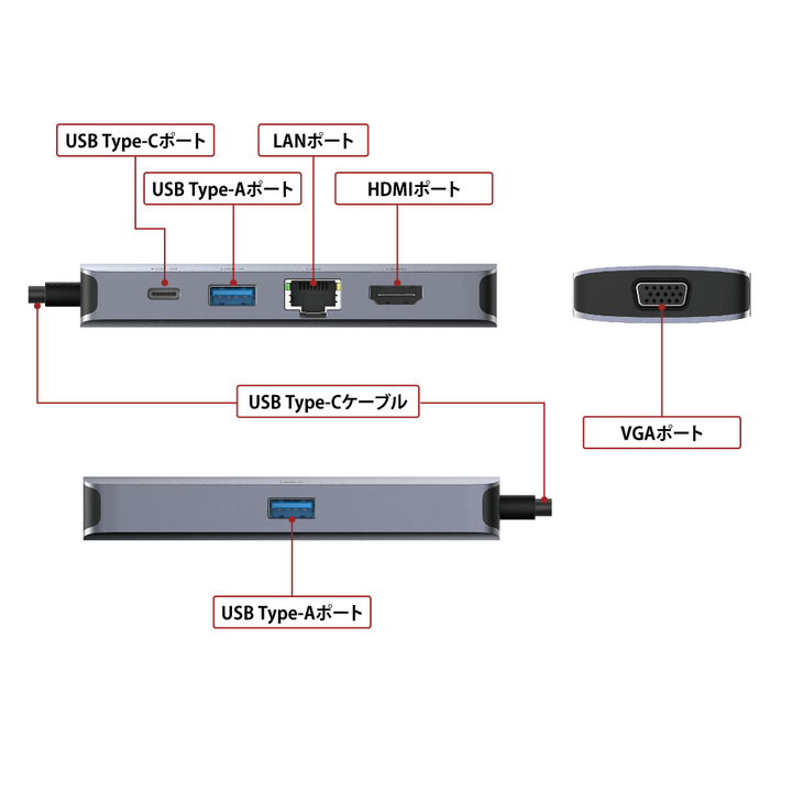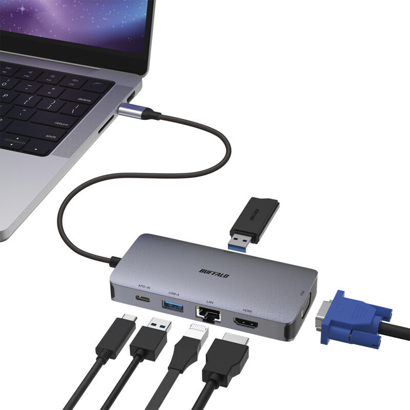 Giga対応の有線LANポート、4K対応のHDMIポート、VGAポート、USB Type-Cポート、USB Type-Aポート(2ポート)を搭載した、GigaとUSB 3.2(Gen 1)対応USB Type-C接続のドッキングステーション