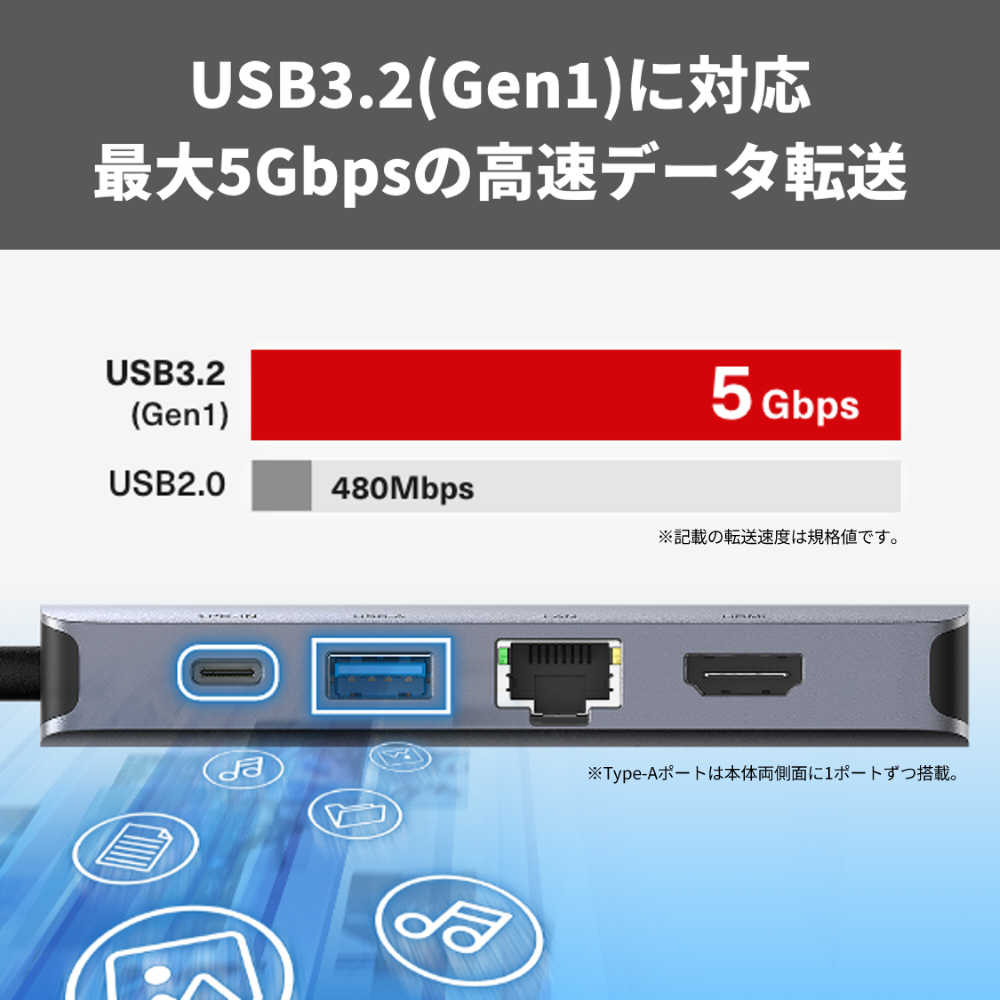USB 3.2(Gen 1)対応のUSB Type-Cポートを1ポート、Type-Aを2ポート搭載。大容量のデータも素早く転送することが可能です。