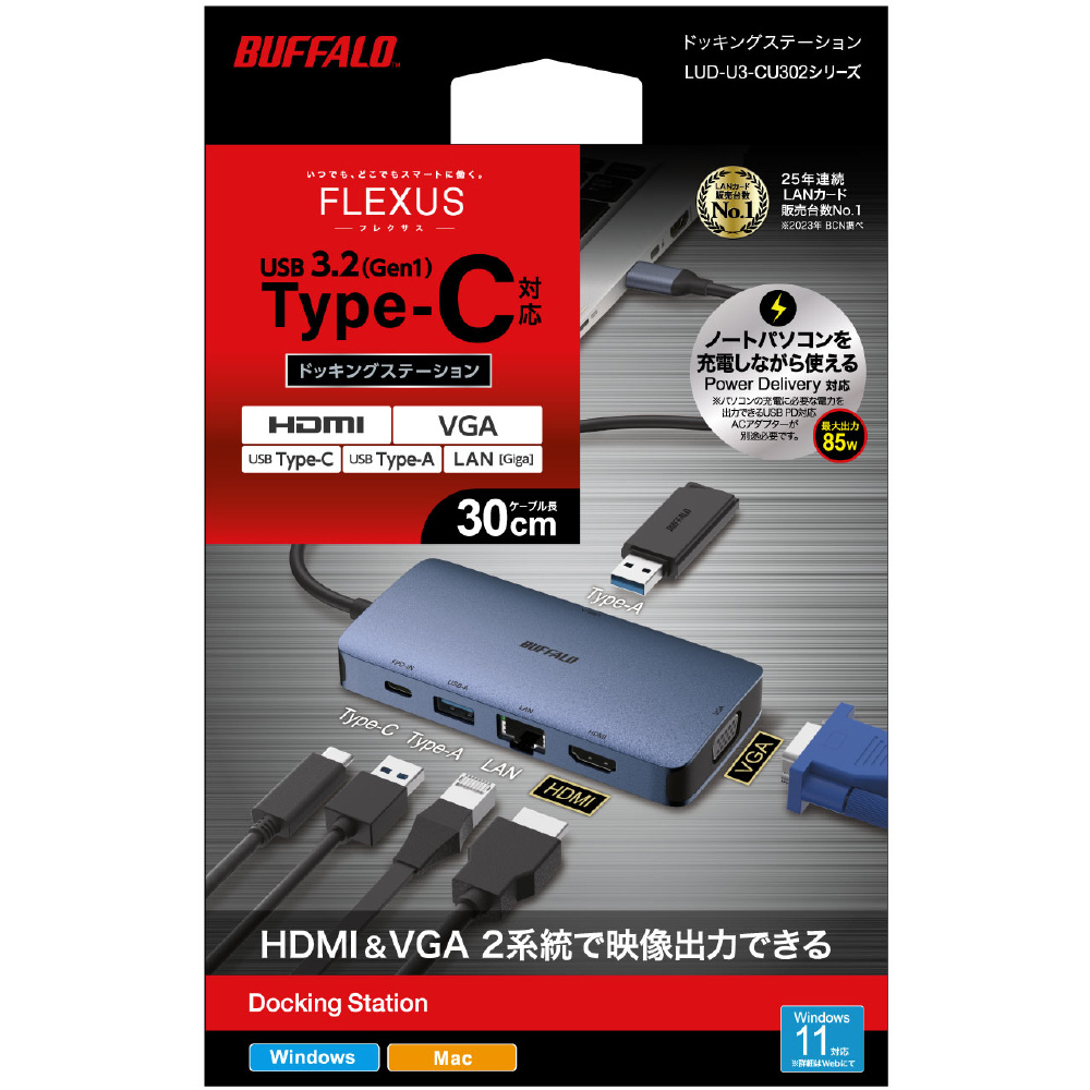 [USB-C オス→メス HDMI / VGA / LAN / USB-Ax2 / USB-C]USB PD対応 100W ドッキングステーション シルバー LUD-U3-CU302SV [USB Power Delivery対応]