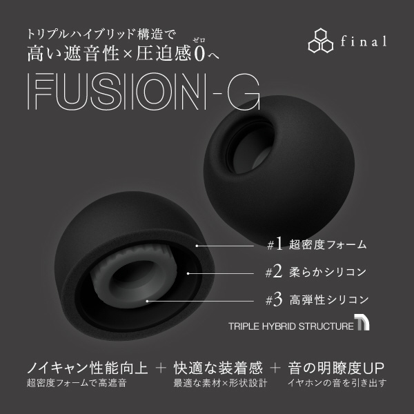「超密度フォーム」「柔らかシリコン」「高弾性シリコン」の3つの素材を組み合わせた独自の「トリプルハイブリッド構造」で、高い遮音性と圧迫感のない快適な装着感を両立しました。