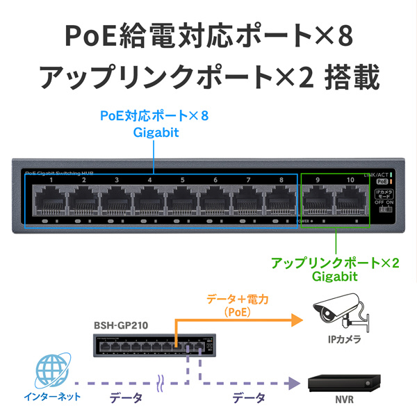 BSH-GP210は、PoE給電に対応したポートを8つ、アップリンクポートを2つ搭載したGigabit対応PoEスイッチングハブです。1ポートあたり最大30W、全体では合計60Wまで給電可能です。全ポートGigabit対応で、高速通信が求められる機器に適しています。
