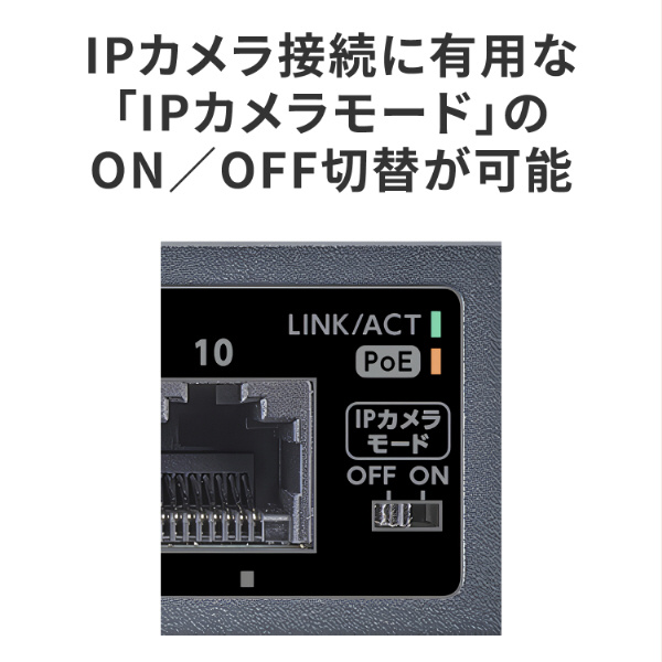IPカメラとの接続時に役立つ機能をまとめた「IPカメラモード※」を搭載しており、任意にON/OFFを切り替えることが可能です。