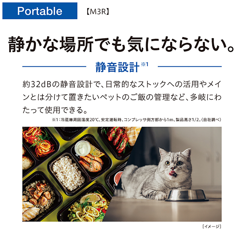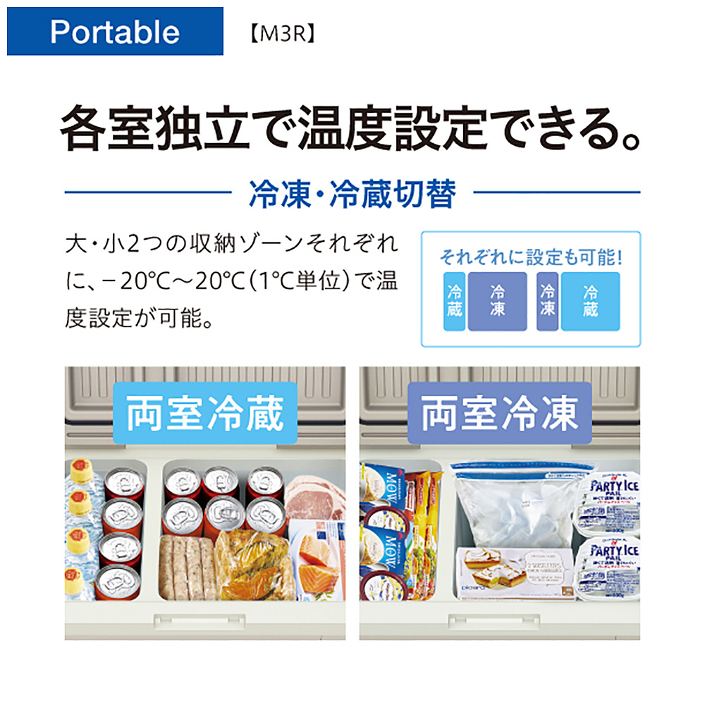 2室独立式で、冷蔵・冷凍を個別設定可能。AC/DC電源対応、家でも車内でも使用可能。静音設計なので、深夜郊外レベル(32デシベル)の静穏性達成。