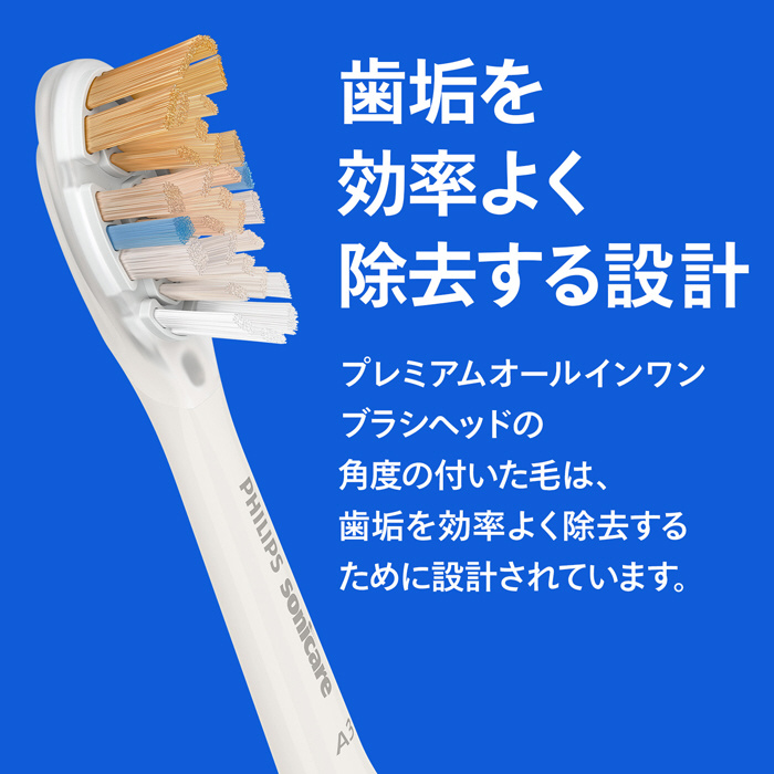 プレミアムオールインワンブラシヘッドの角度の付いた毛は、歯垢を最大限に除去するために設計されています。