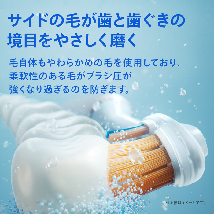 歯を磨きながら同時に、ブラシヘッドのサイドの毛が歯と歯ぐきの境目をやさしくブラッシングし、約 2 週間で歯ぐきの健康を推進※。