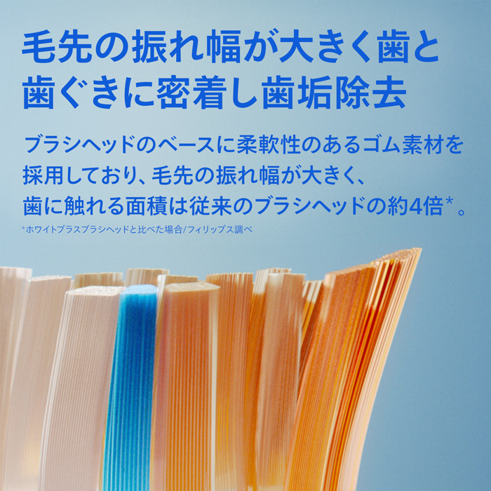 ブラシヘッドのベースに柔軟性のあるゴム素材を採用しており、毛先の振れ幅が大きく、歯に触れる面積は従来のブラシヘッドの約4 倍※。
