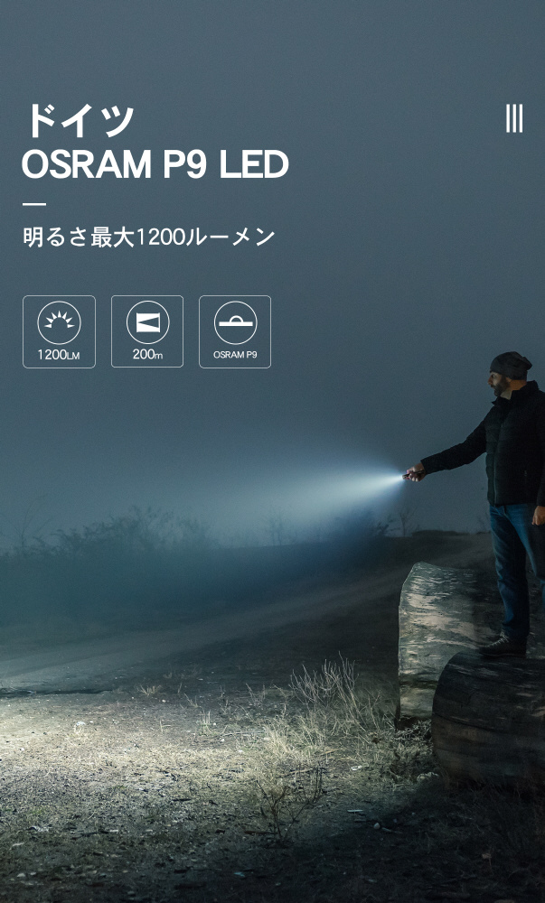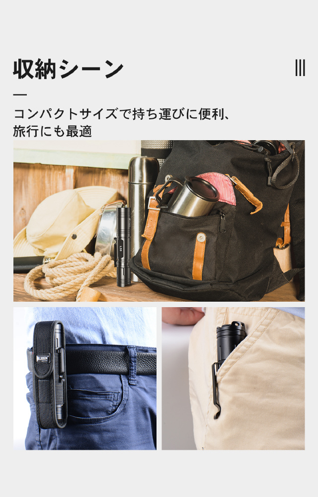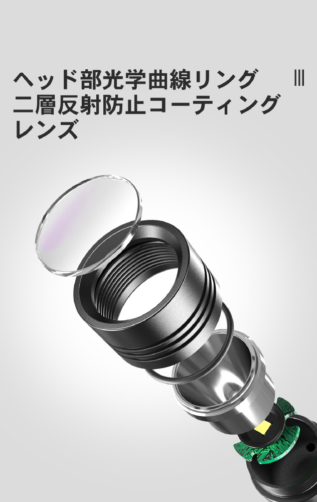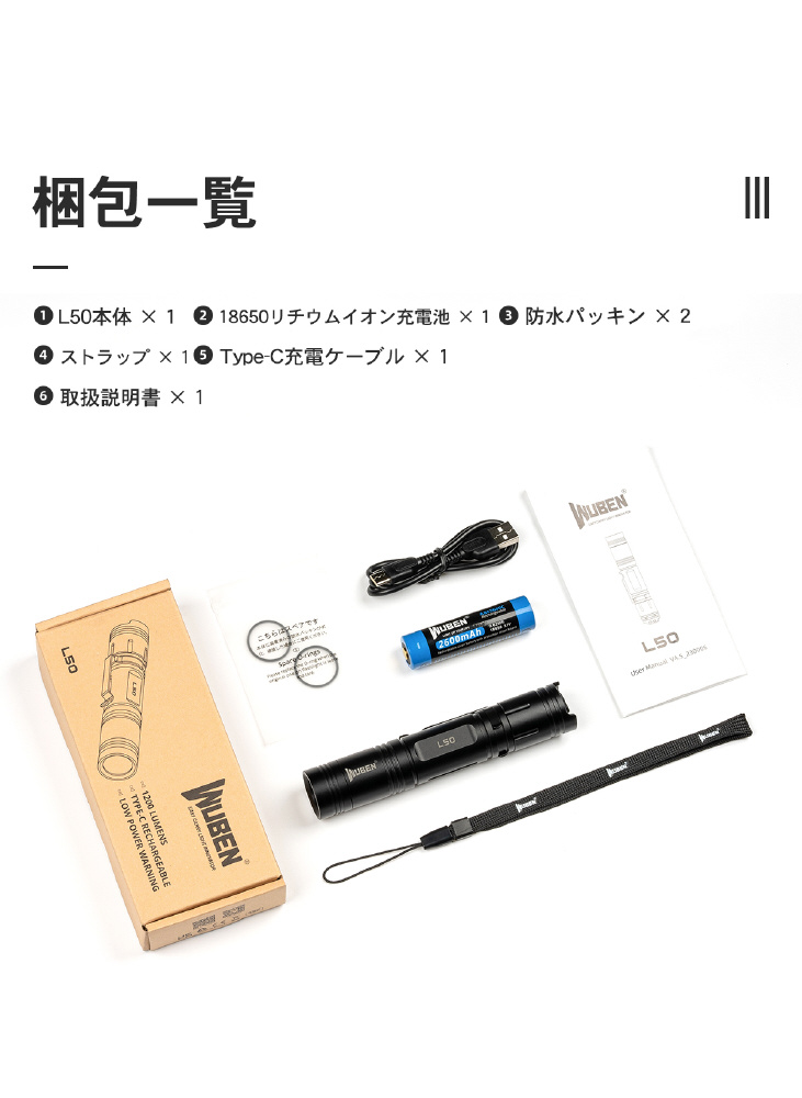 付属品 USB充電ケーブル、18650リチウムイオン電池、防水リング(スペア)、ストラップ