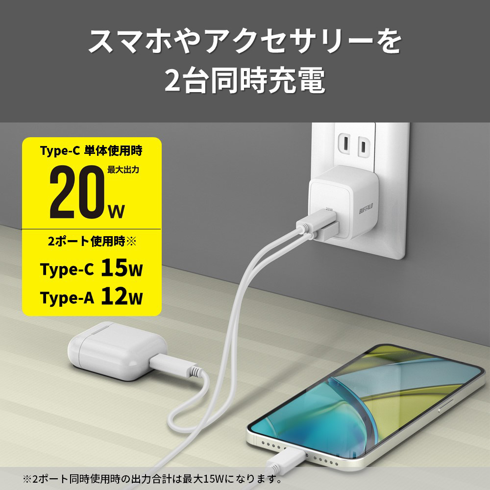 ※1ポート使用時20W出力、2ポート使用時はType-Cポート最大15W・Type-Aポート最大12Wで合計15Wまで出力可