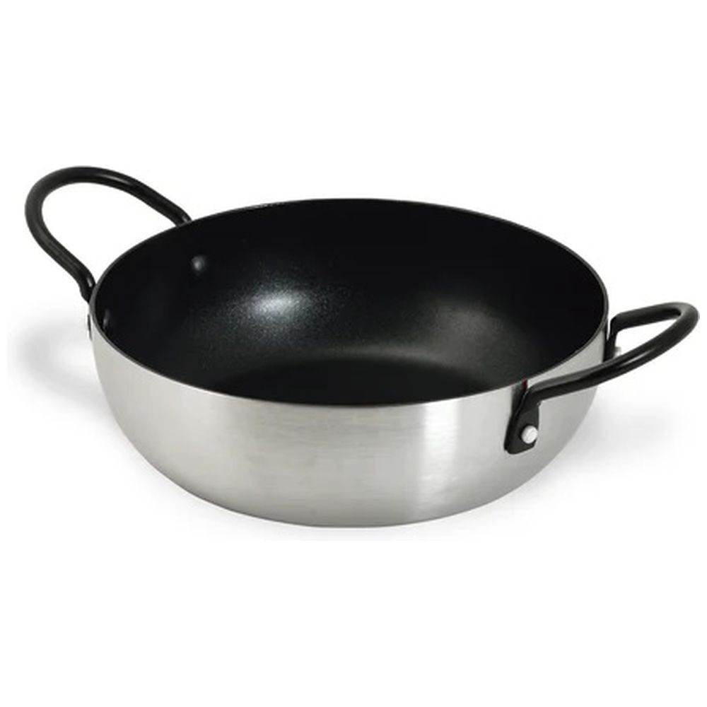 素材:本体:ステンレス鋼(クロム16%)、アルミニウム合金、取っ手:鉄(焼付塗装)、表面加工:ふっ素樹脂塗膜加(内面)