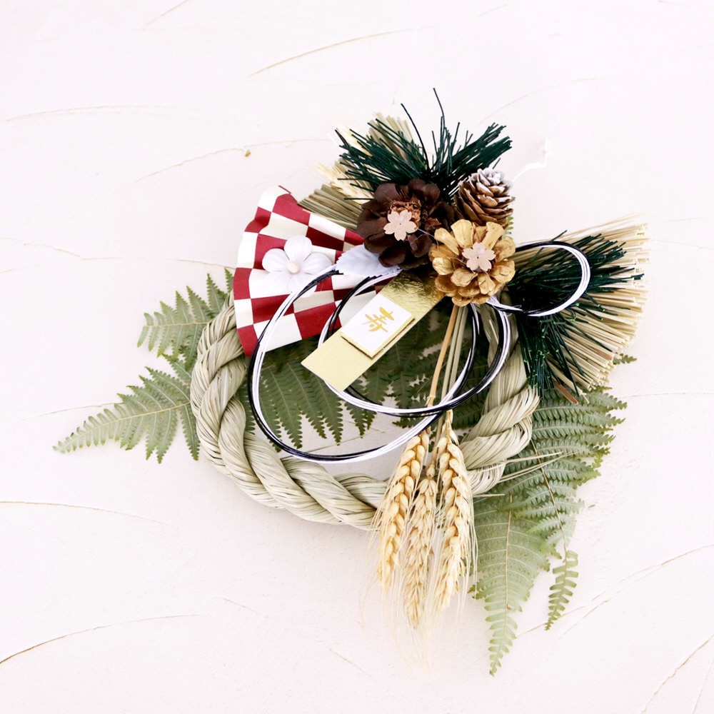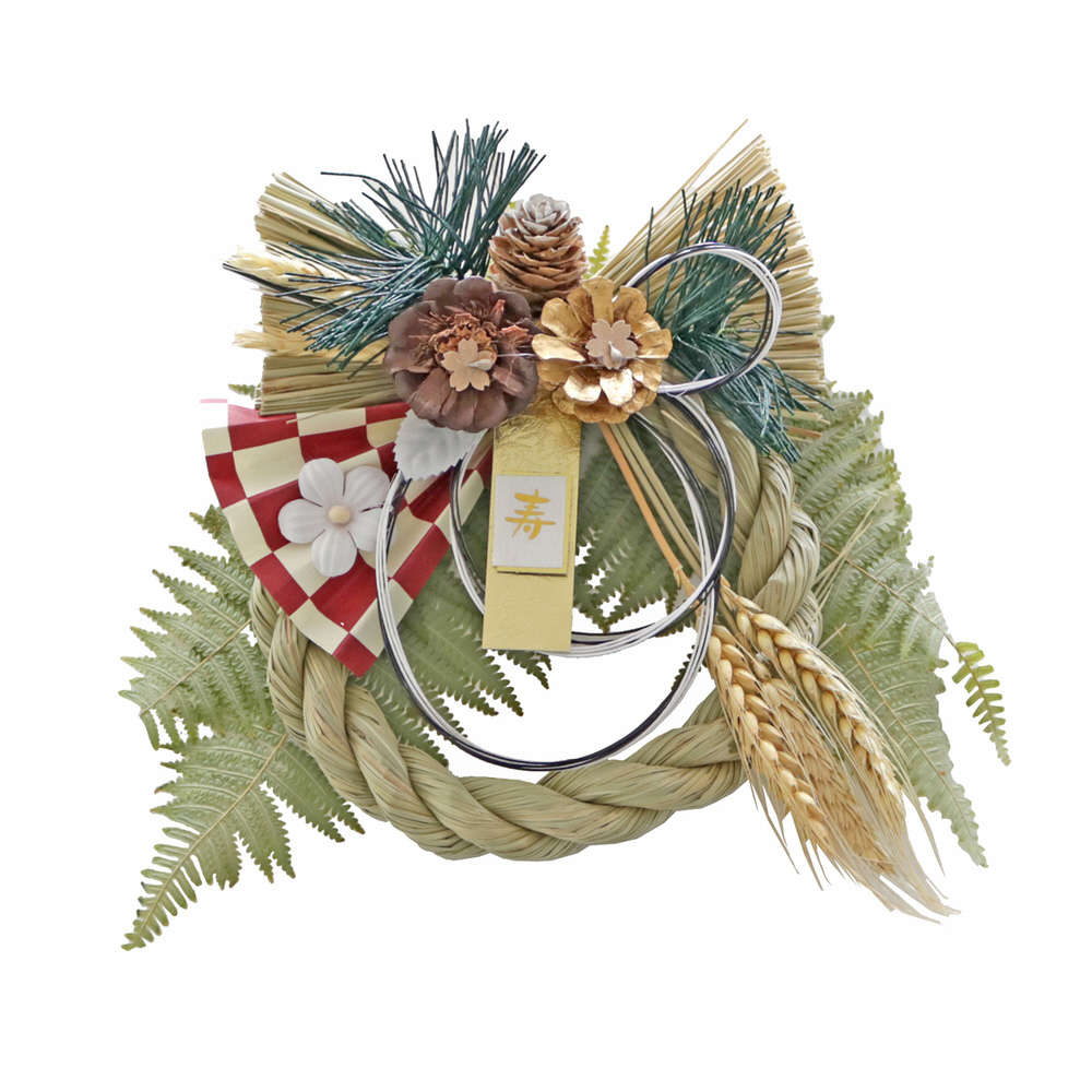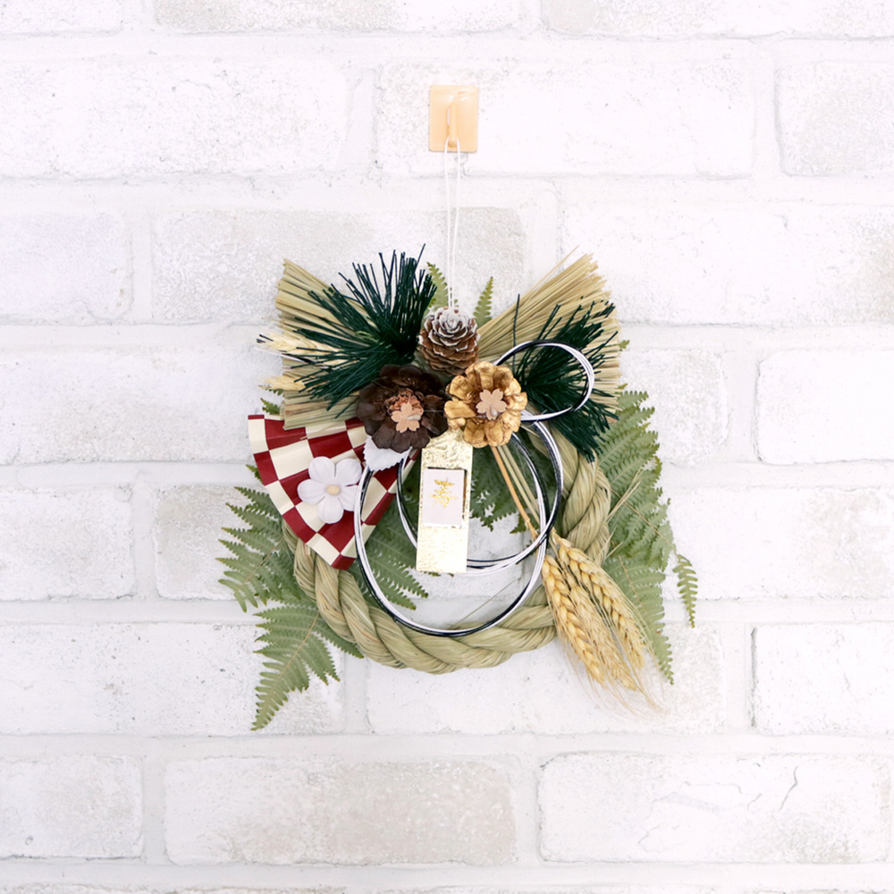 草・紙・麦穂・松の果実など植物由来からできた迎春飾り。玄関・室内用。取付フック付き