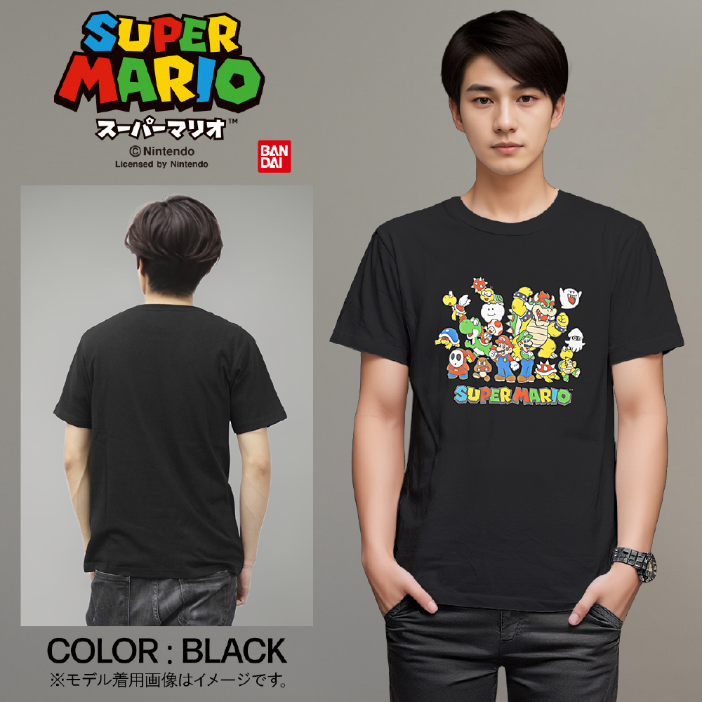 フロントには、マリオやルイージなどをはじめとした人気キャラクターが勢ぞろいしたデザインがプリントされています。サイズはMからXLまでのサイズ展開です。ファンならずとも見逃せないアイテムです♪