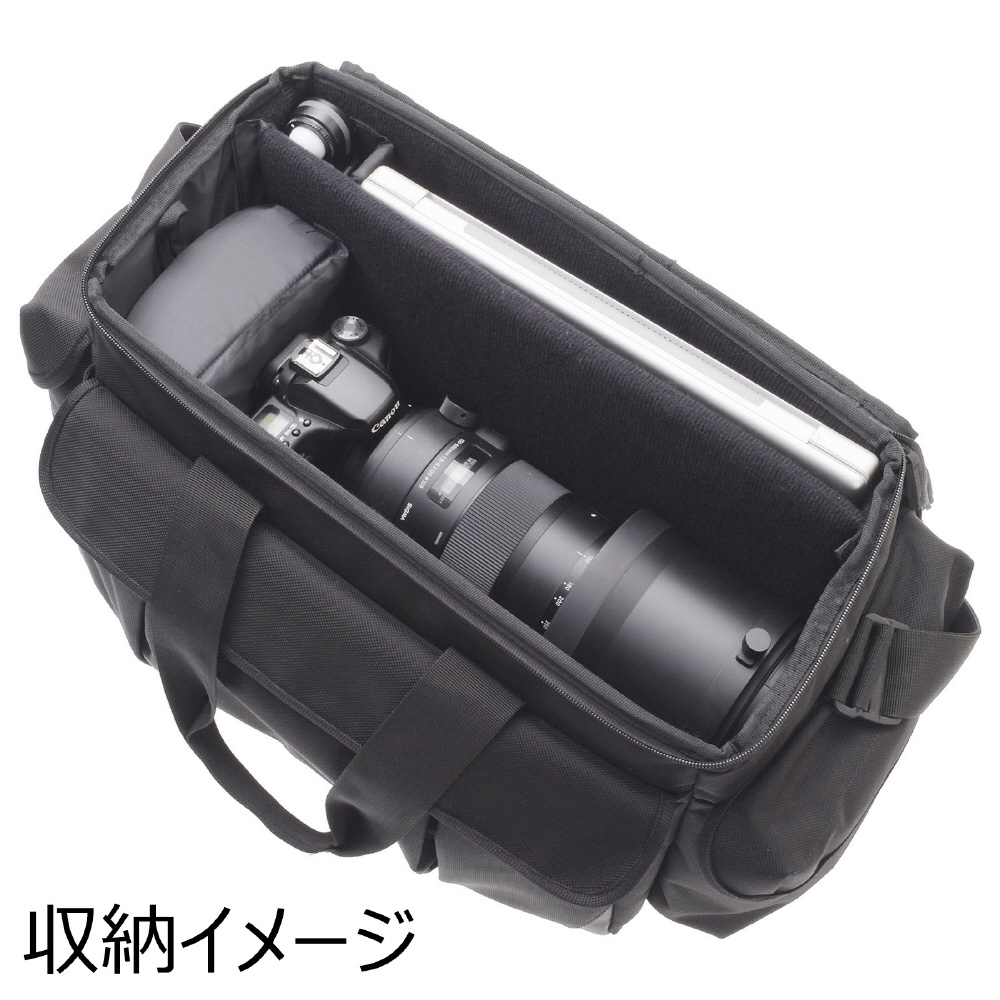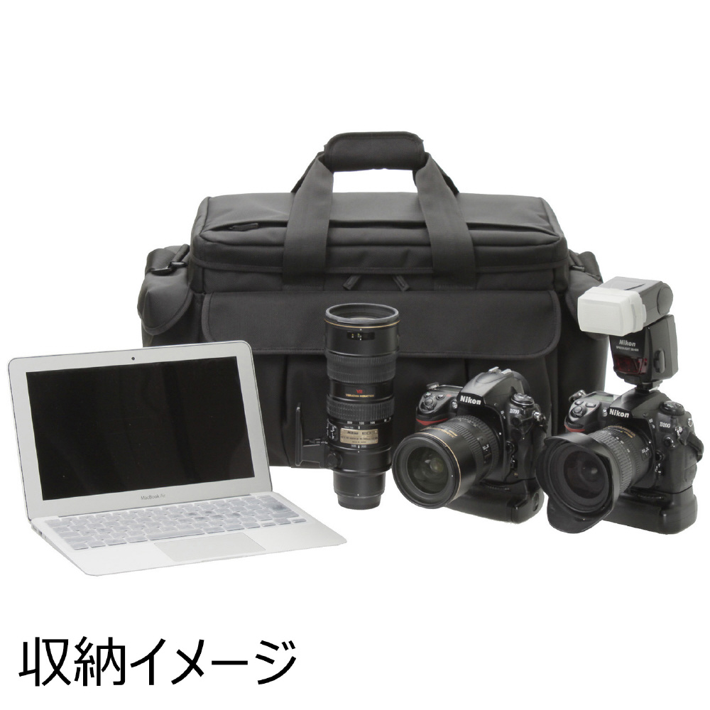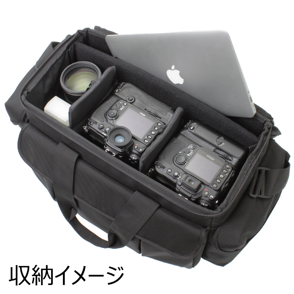 【収納例】バッテリーパック付きの一眼レフ2台+16-35mmF2.8+24-70mmF2.8+70-200mmF2.8クラスのレンズ+ストロボ+ノートPC(最大で15インチMacBookProに対応)○背負いベルト装着可(別売)