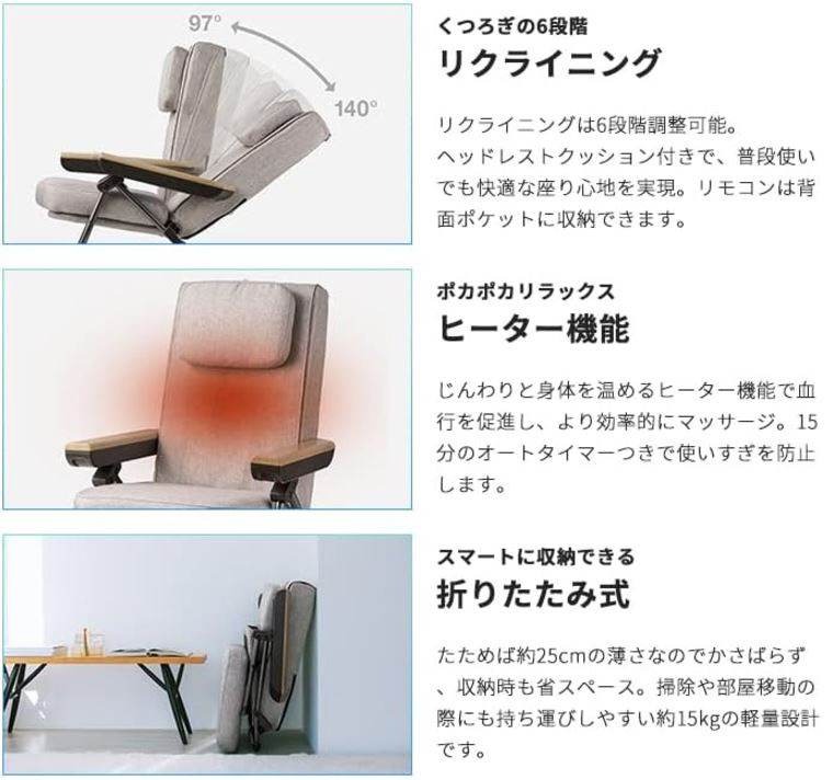 ヒーターでじんわり身体を温めながらマッサージすれば、人の手のような心地よさに。