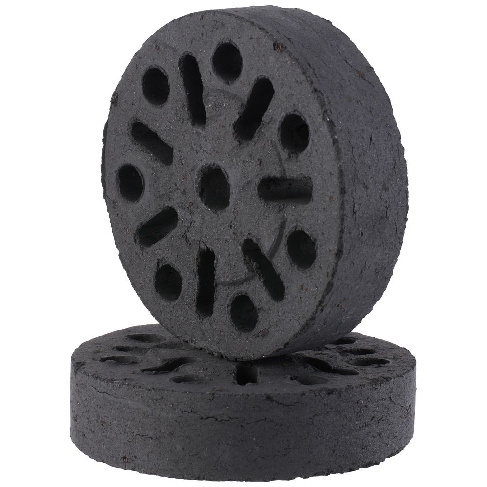 平たく成型したココナッツチャコールに通風孔を開け、さらに片側を凸面にしたことで、平面に置いても炭の下に空気の通り道を確保し、燃焼効率を高めています。