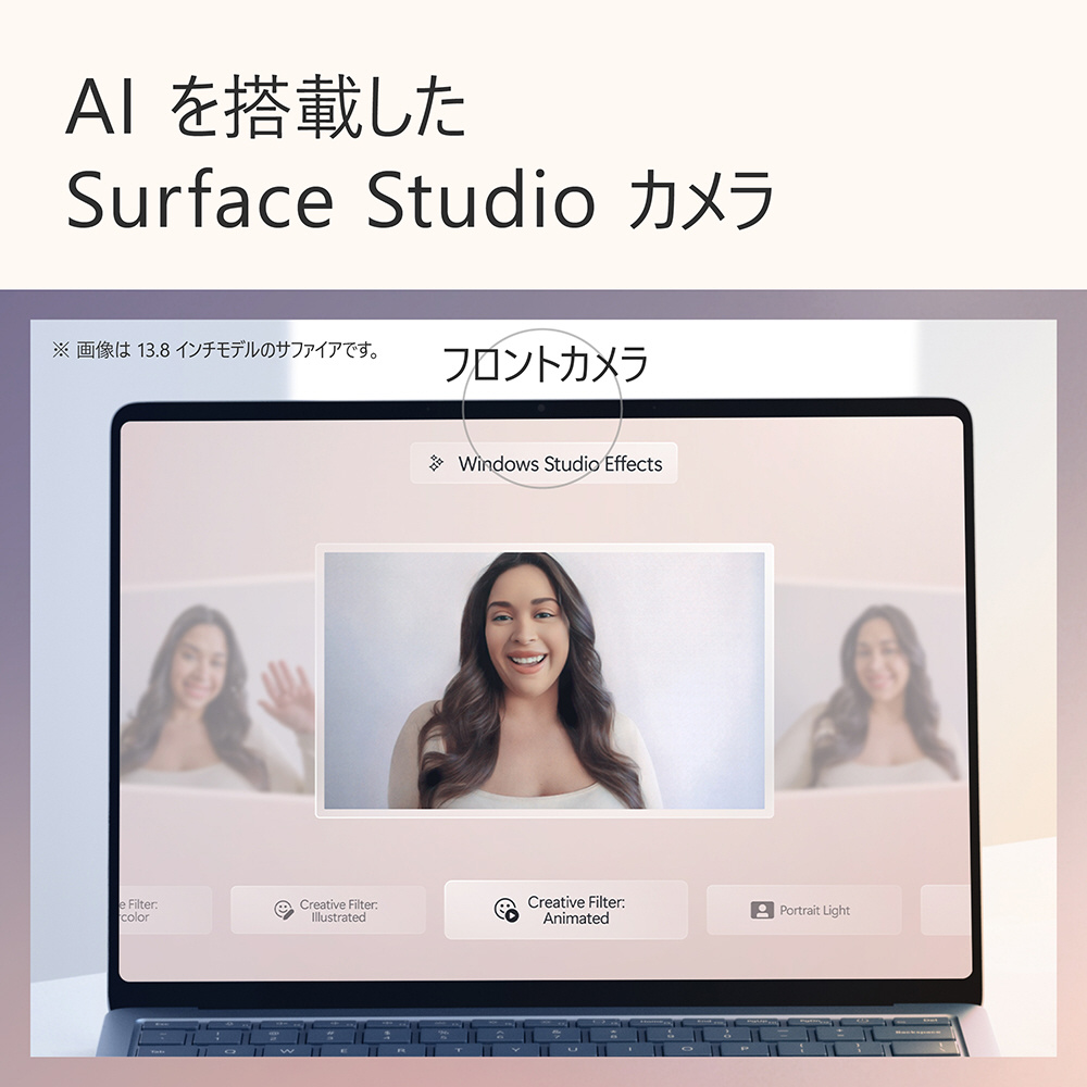 フル HD フロント Surface Studio カメラ 1080P フル HD カメラ 自動フレーミング、クリエイティブ フィルター (イラスト、アニメーション、水彩画)、アイ コンタクト、テレプロンプター、ポートレートぼかし、ポートレート ライトを備えた Windows スタジオ エフェクト Windows Hello 顔認証カメラ
