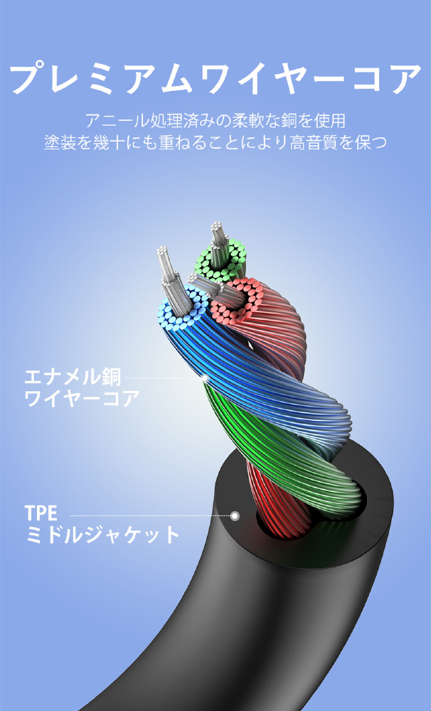 Hi-Fi オーディオでノイズ知らず。アニール処理済みの柔軟な銅を使用。塗装を幾十にも重ねることにより高音質を保ちます。しなやかなTPEジャケットを使用し、柔軟性と強度に優れたケーブル。