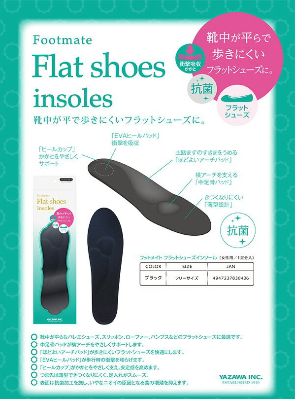 靴の中が平らなバレエシューズ、スリッポン、ローファー、パンプスなどのフラットシューズに最適です。「ほどよいアーチパッド」が歩きにくいフラットシューズを快適にします。「EVAヒールパッド」が歩行時の衝撃を和らげます。「ヒールカップ」がかかとをやさしく支え、安定性を高めます。つま先は薄型できつくなりにくく、足入れがスムーズ。表面は抗菌加工を施し、いやなニオイの原因となる菌の増殖を抑えます。