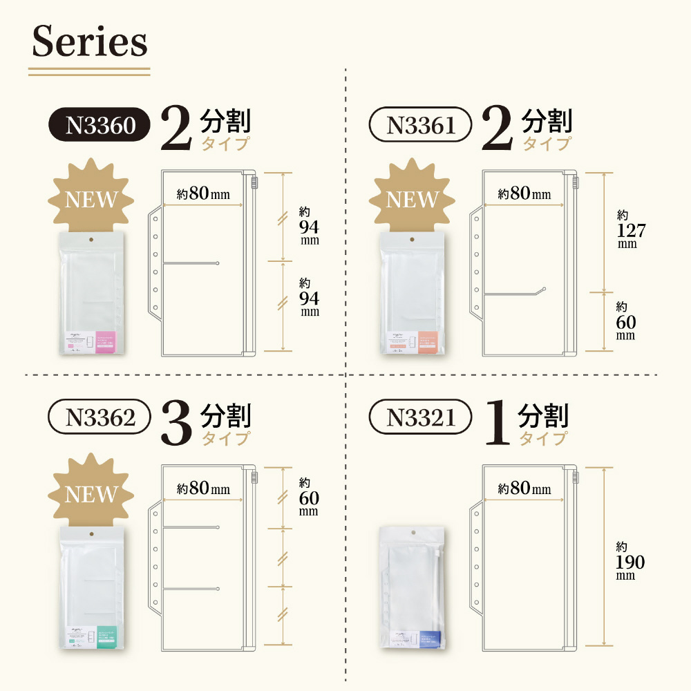 収納物を入れた本商品をコレクションバインダー(N3320)にとじることでお気に入りの小物を一緒に持ち運べます。