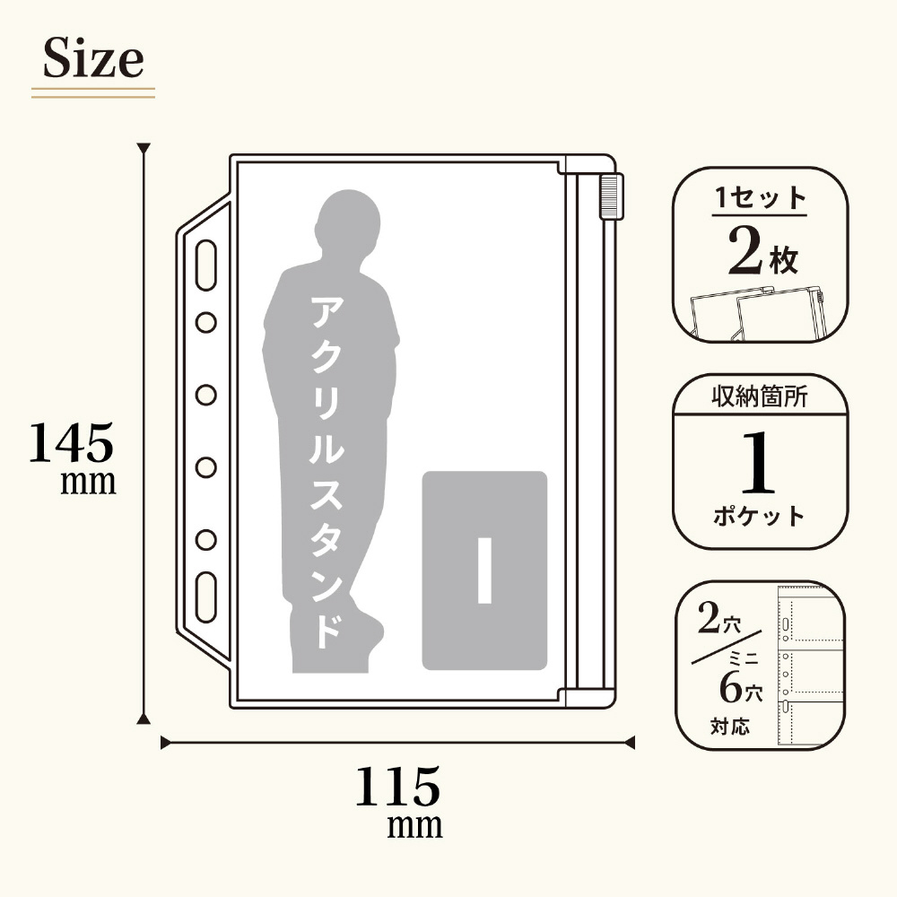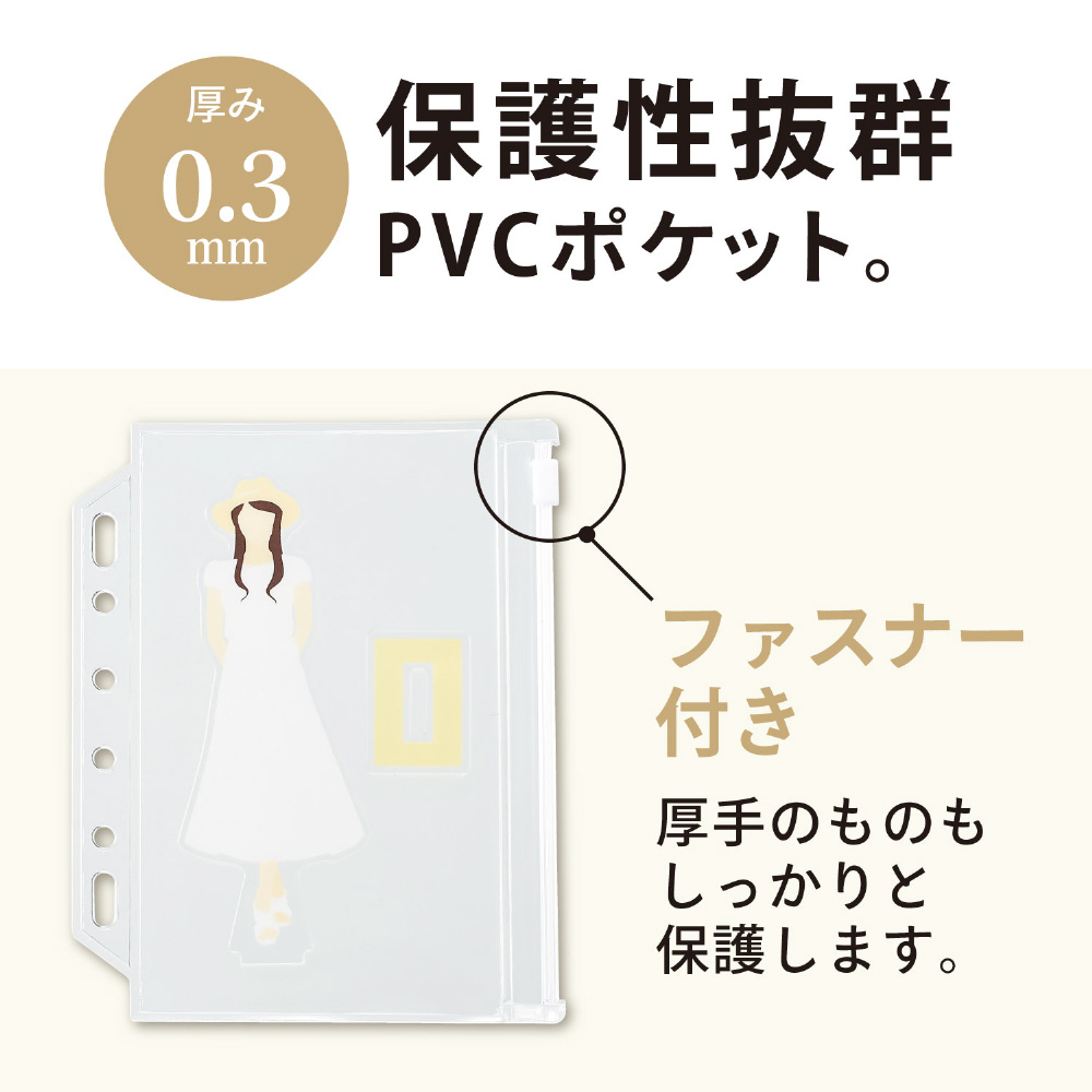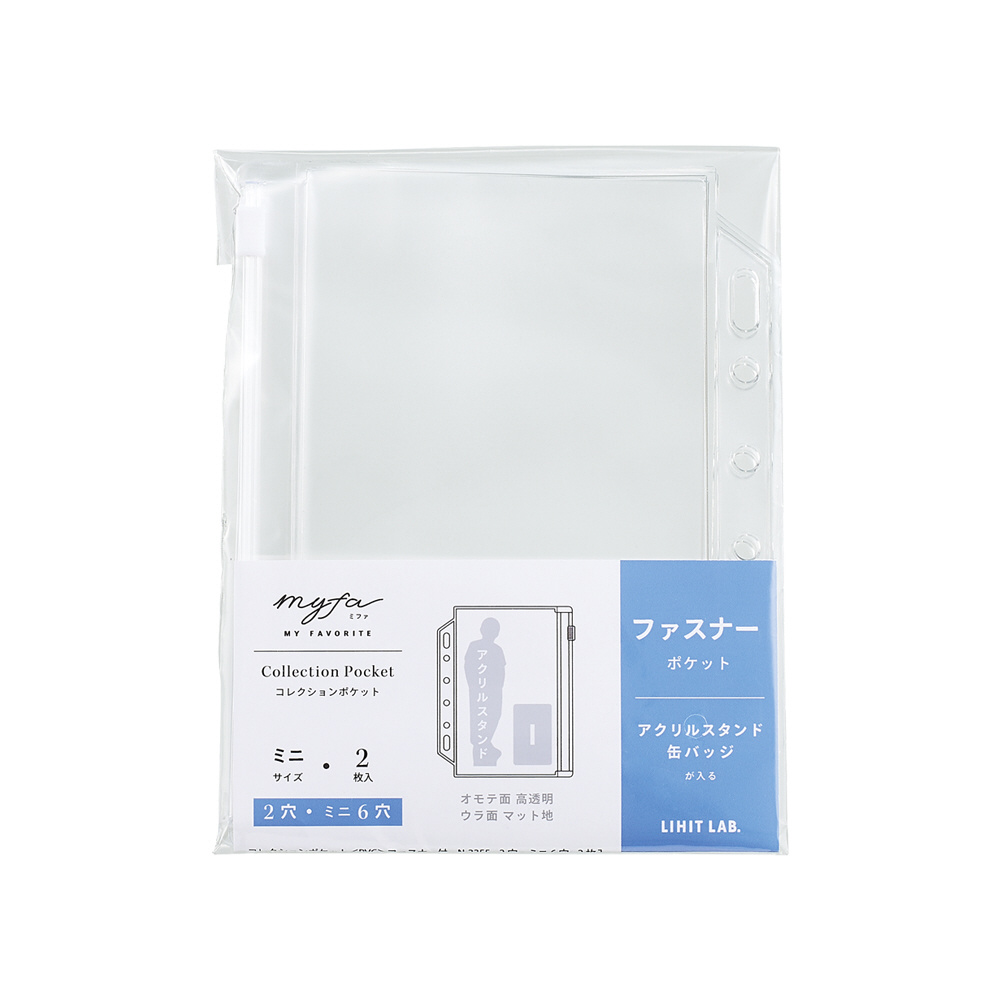 コレクションや小物の整理に便利なクリヤーポケット。2 穴・ミニ6 穴ファイルに対応。アクリルスタンドや缶バッジの収納に。