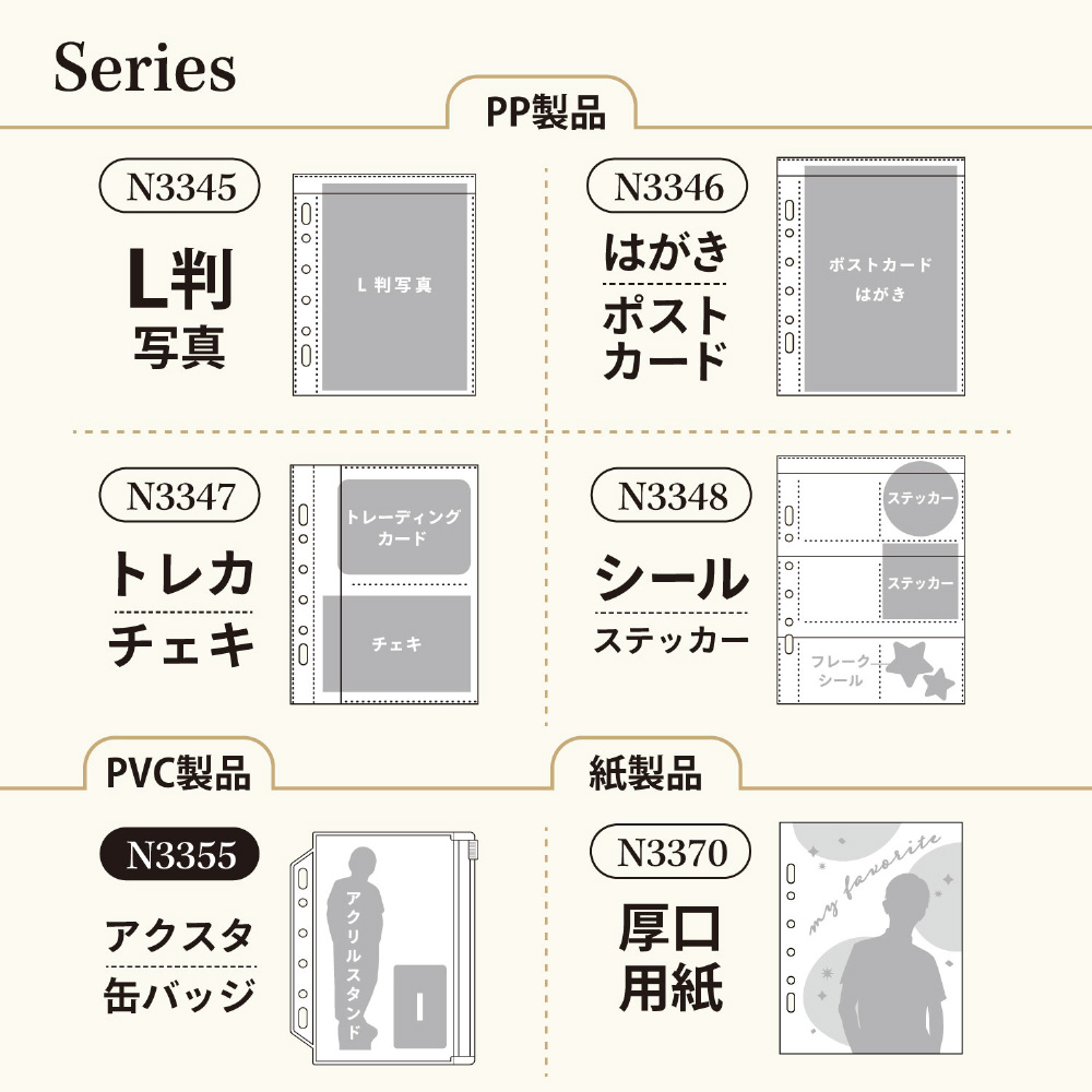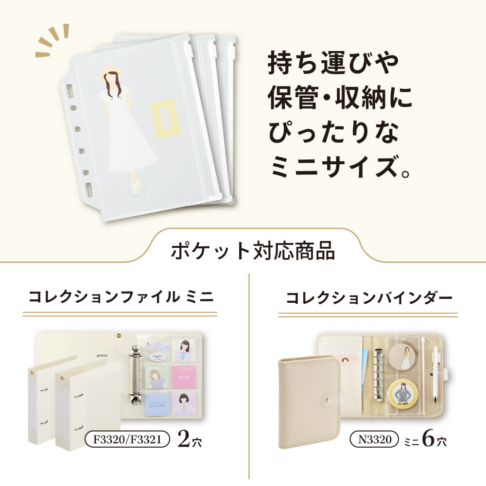 コレクションファイルミニ(F3320・F3321)、コレクションバインダー(N3320)に収納可能です。2穴・ミニ6穴ファイルに対応しています。