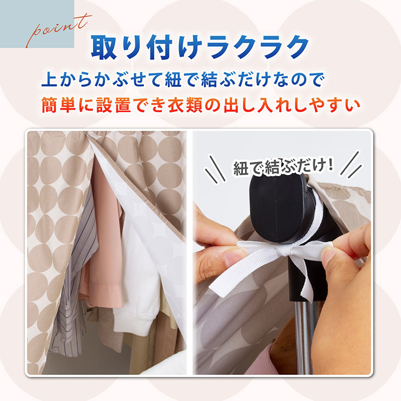 両サイドのひもで簡単にハンガーラックに固定でき、ずり落ちる心配いらず。