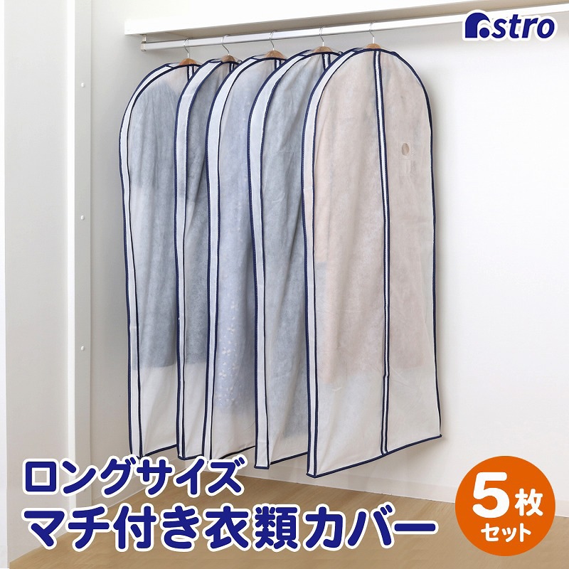 シワをつけたくない大切な衣類を吊り下げたままホコリや汚れから守る衣類カバー。マチ付きで厚手の衣類の収納もでき太いハンガーも通せる。
