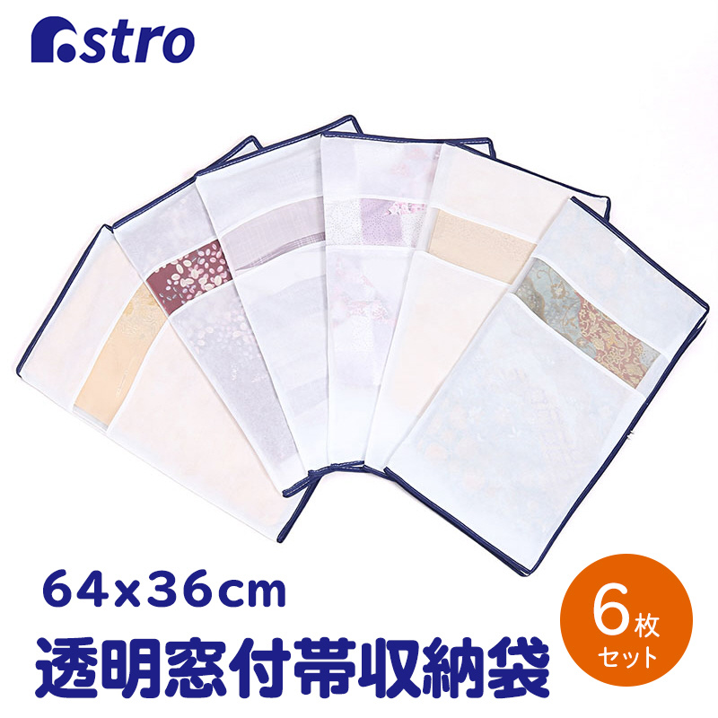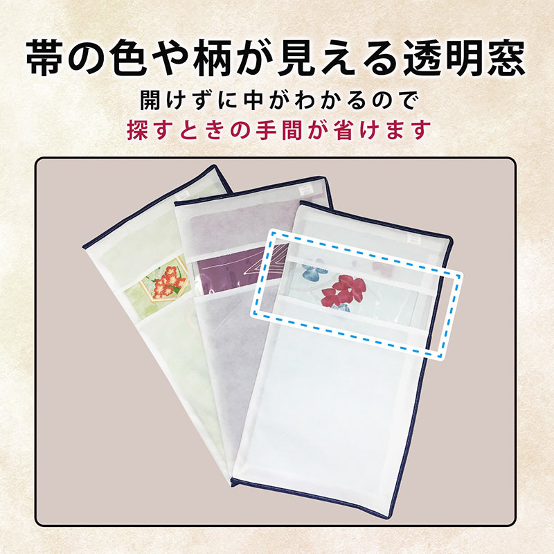 透明窓が付いているので袋を開けずに帯の色や柄の確認ができ管理しやすい。使わないときは折りたたんでコンパクトに保管できる。