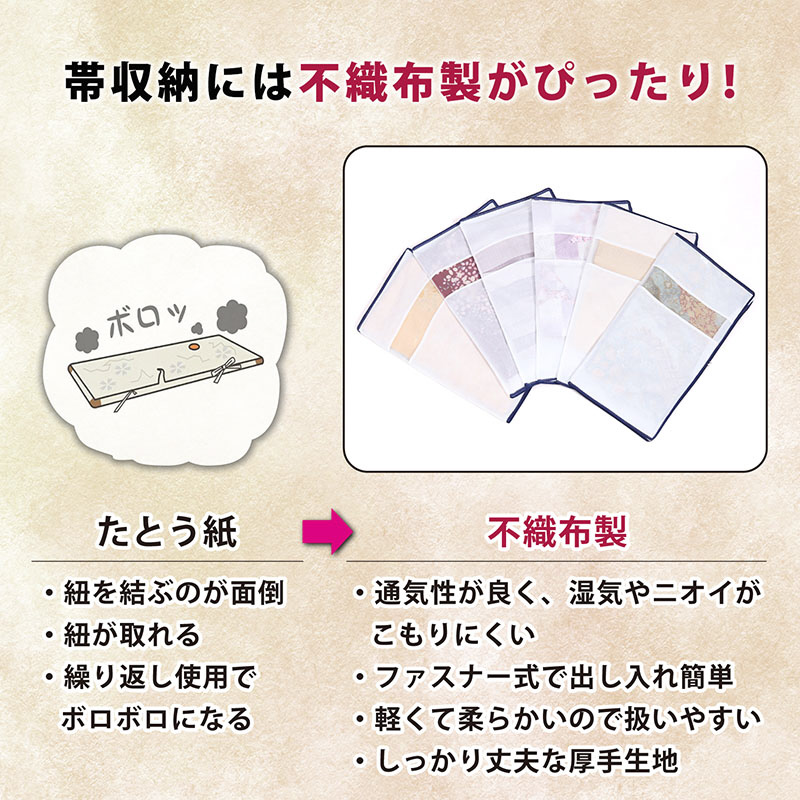 湿気やにおいのこもりにくい通気性の良い不織布製。大切な着物の帯をホコリから守り保管できる。