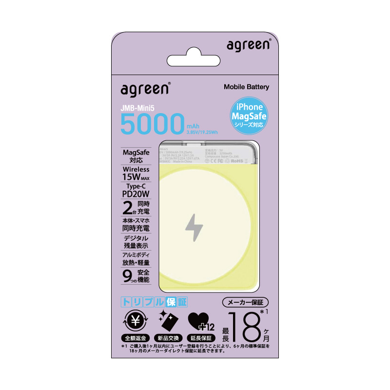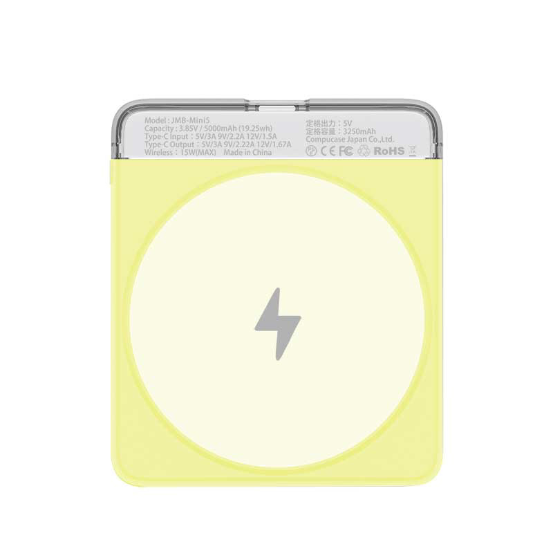 超小型モバイルバッテリー 5000mAh PD20W高速充電 全額返金トリプル保証 agreen パステルカラーイエロー JMB-Mini5-YE