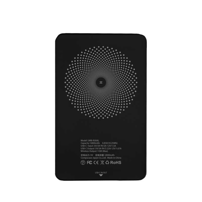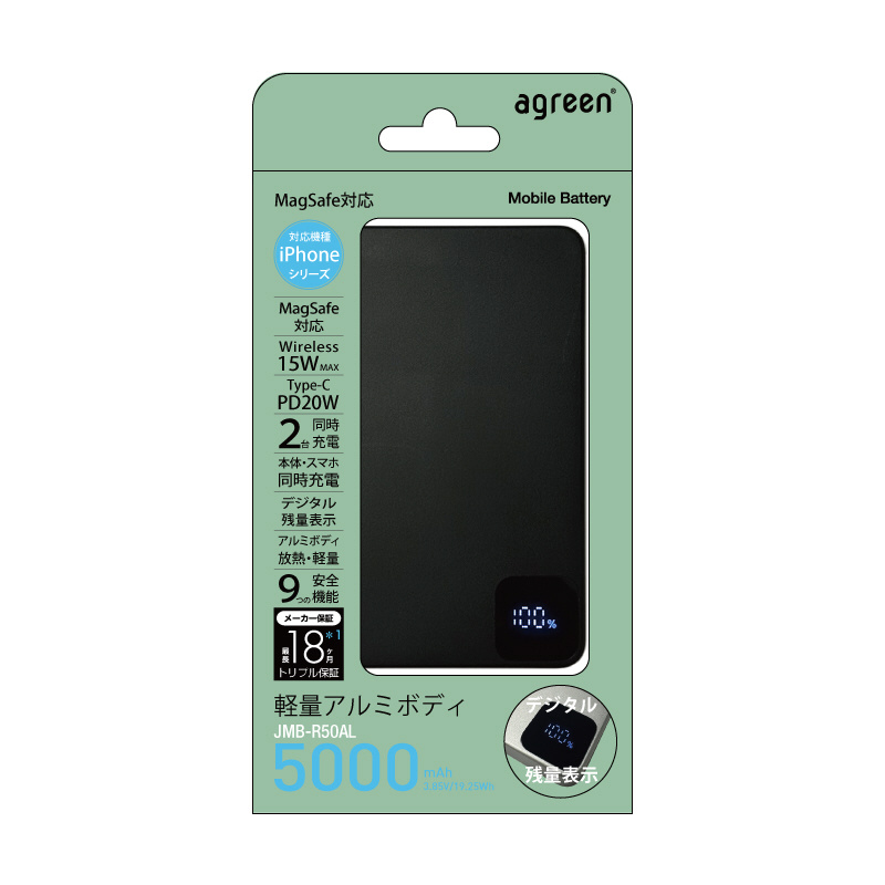 超薄型アルミ製マグセーフ残量%付き(PD20W)5000mAh agreen ブラック JMB-R50AL-BK