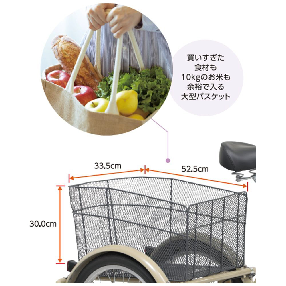 【前カゴ寸法/前後32cm・幅41cm・高さ24.5cm】【リヤバスケット寸法/前後52.5cm・幅33.5cm・高さ30cm】