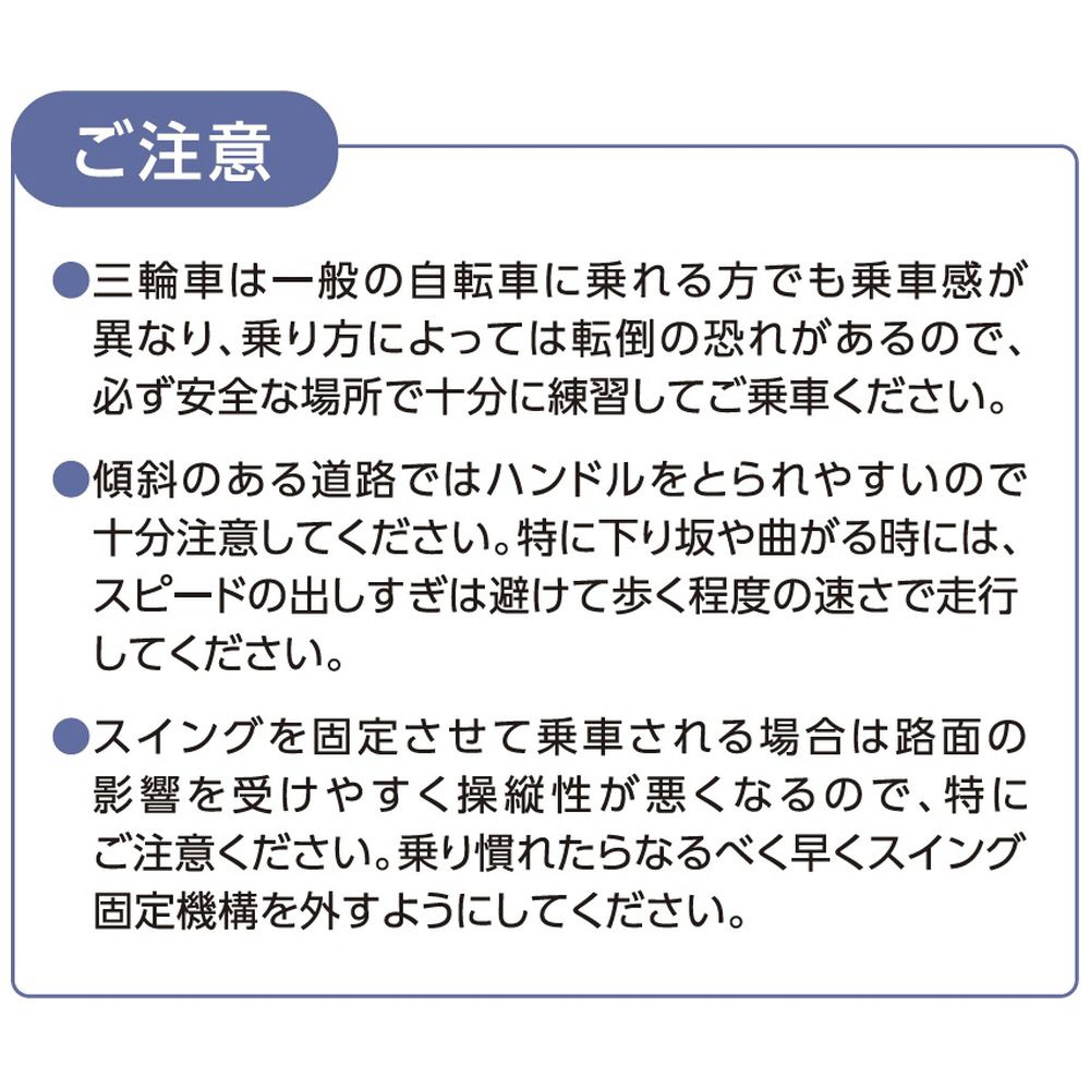 三輪車は一般の自転車に乗れる方でも乗車感が異なり、乗り方によっては転倒の恐れがあるので、必ず安全な場所で十分に練習してご乗車ください。